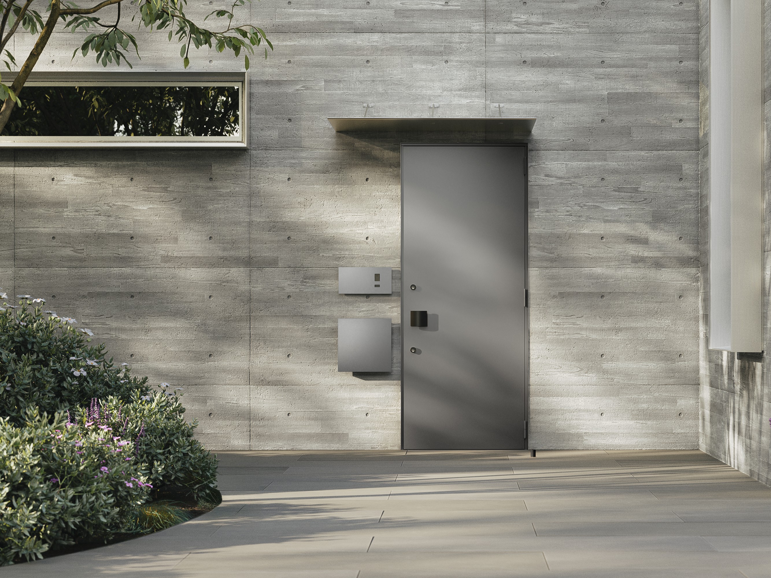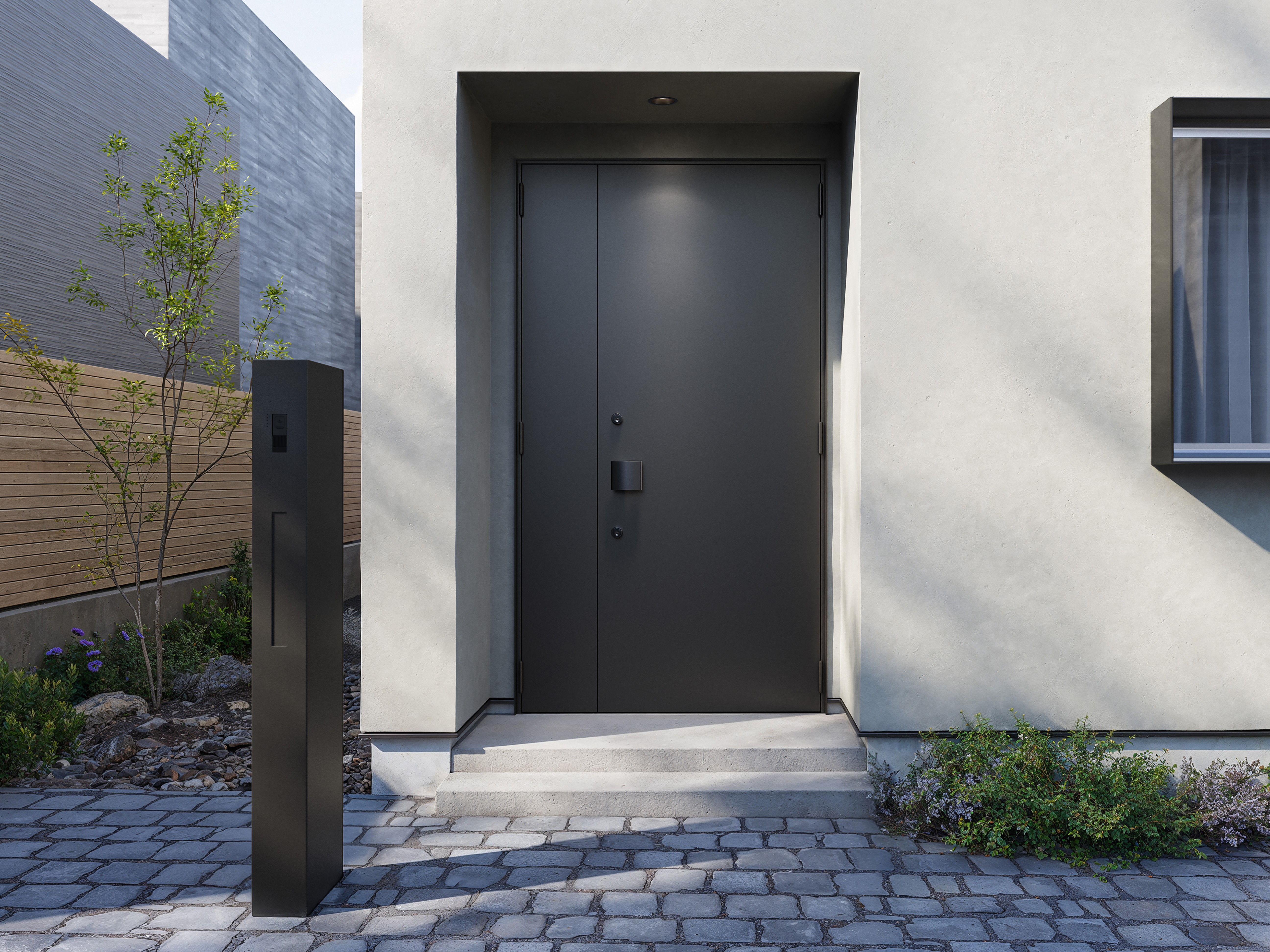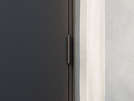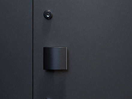 《ベリドール》は準防火地域に対応した防火ドア※です。扉左右と上部の枠の見付け幅(ドア枠の細さ)を揃え、エッジをシャープに仕上げることで、外壁に埋め込まれたような一体感を実現しました。さらに、ドア枠と扉面の段差を限りなく無くすことで、より洗練された印象に仕上げました。カラーは、ブラック・グレー・ホワイトの3色展開です。鍵はディンプル錠と鎌錠の2ロック式で、スマホや暗証番号などを使う電子錠を後付けすることも可能です。