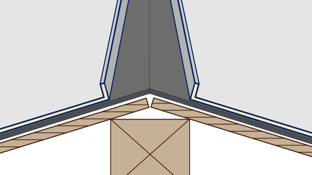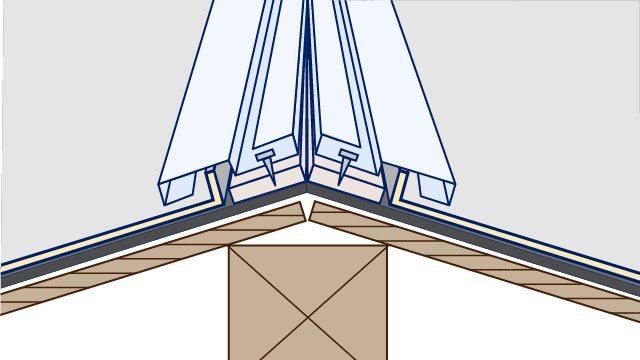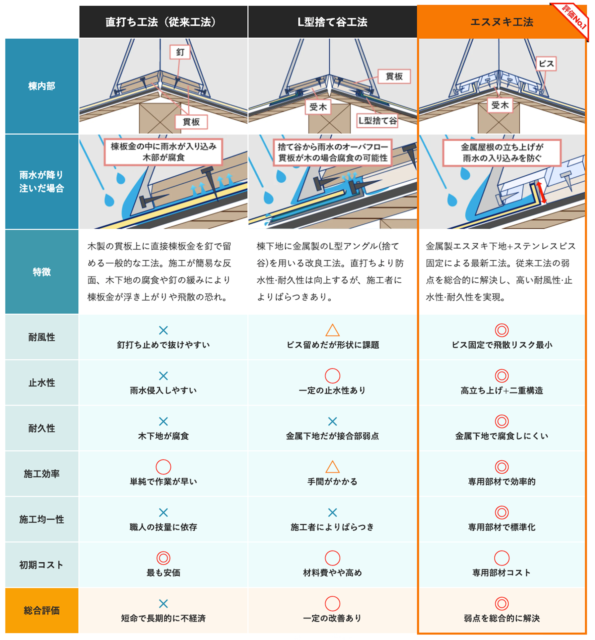 棟板金の工法は、一般的に貫板に直接釘で留める「直打ち工法」、L型捨て谷を使用した「L型捨て谷工法」があります。それぞれの工法を内部構造や性能面から比較した場合、総合的に金属下地エスヌキが最も耐久性、止水性に優れた部材と言えます。