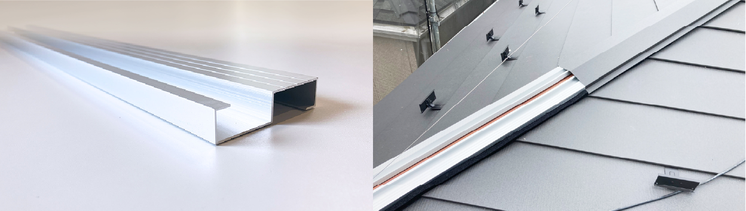 素材は腐食に強いアルミ製です。人工的に酸化被膜を生成させた「アルマイト処理」が施されているので、耐腐食性や耐摩耗性に優れています。雨水による腐食だけでなく、熱による変形も防ぎます。1.3㎜厚の高耐久の金属下地が棟をしっかり支えます。