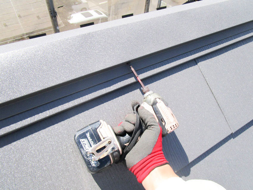 棟板金とエスヌキは、パッキン付きのステンレスのビスで固定します。