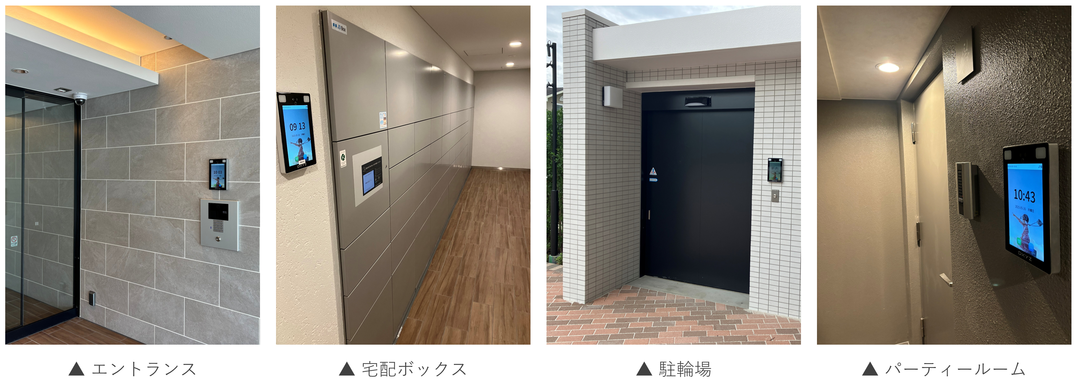 今回DXYZは、本物件のエントランス2カ所、宅配ボックス、ゴミ置き場、駐輪場入り口、パーティールームの計6カ所に顔認証プラットフォーム「FreeiD」を導入しております。パーティールームにおいては、「FreeiD Reserve」が利用可能となっており、本物件の入居者は「FreeiD」から施設を予約すると当日は顔認証でスムーズにご利用いただけます。