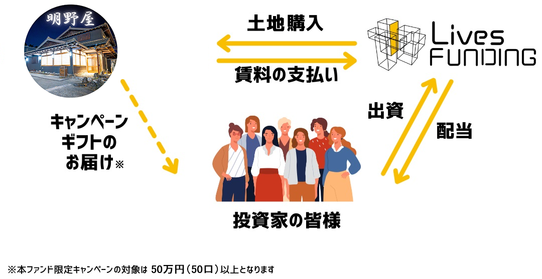 ご出資額に応じて、明野屋などの宿泊施設で使える「宿泊金券5万円分」をプレゼント。さらに期間中の新規投資家登録+50万円以上のご出資で、Amazonギフト券5,000円分を進呈するWプレゼントキャンペーンも実施中。