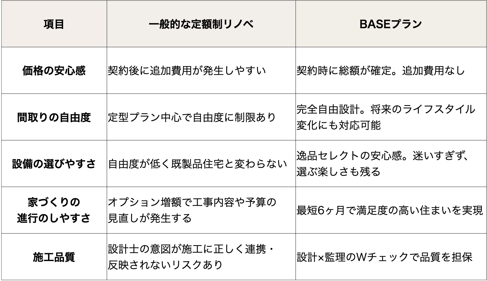 これに対してゼロリノベでは創業当初から予算管理を徹底し、 “当初予算比105%” を維持。独自の予算管理の知見を集約して開発した新プランが、完全定額制の『BASE』です。