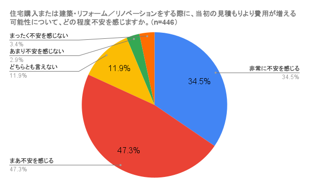 ●81.8%が「見積もり増額に不安を感じる」と回答。費用が増えるとわかった場合、46.6%が「計画を延期・中断」、19.7%が「施工/仲介会社を変更」と回答し、費用の不透明さがユーザー行動を大きく阻害する実態が浮き彫りに。