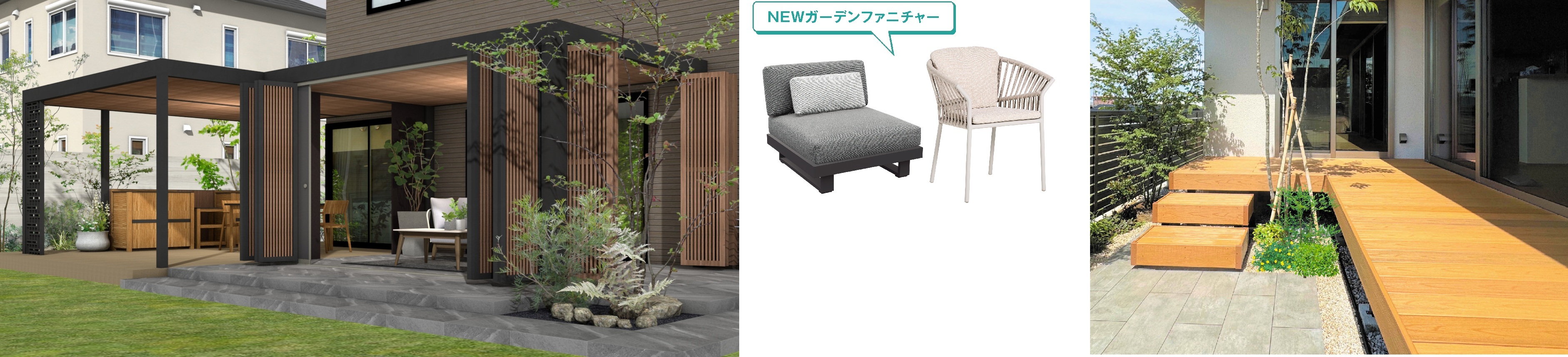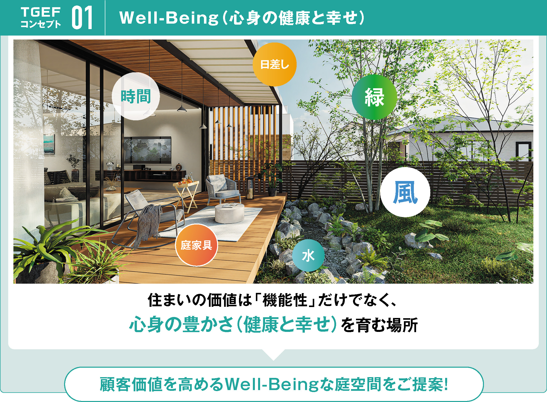 本展示会では、自然の光や風、緑に囲まれた「Well-Being」な空間づくりとして、庭や外構を“もうひとつの部屋”として活用することで、心身の健康と幸せのある暮らしを提案します。