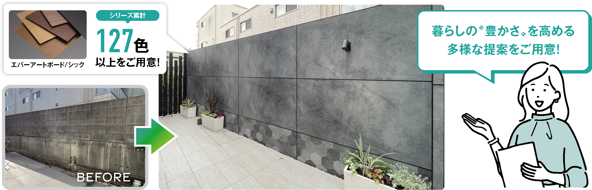 化粧建材パネル「エバーアートボード」を活用した外構リフォームをはじめ、狭小スペースを魅力的に演出する庭提案を事例とともにご紹介。また、ユーザー視点での外構・庭での悩みごとを解決するアイデアをご紹介。住まいの価値と暮らしの満足度向上へとつなげていただける内容となっています。