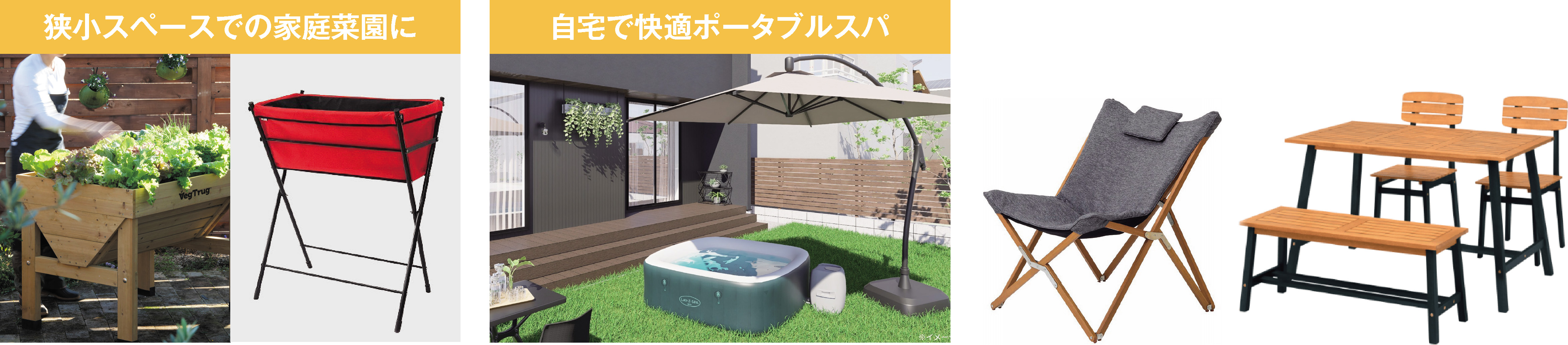 暮らしや体験をより豊かにさせる、リビングガーデン商品をご紹介。ポータブルスパや、家庭菜園アイテム、お求めやすい屋外家具など、お客様のアフターフォローの提案に最適な多様なアイテムをご覧いただけます。