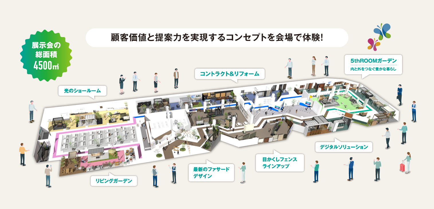 本展示会のテーマは、「新築からリフォーム・リノベーション時代に向けて」とし、庭空間を通じたWell-Being(心身の健康と幸せ)の提案や、デジタルソリューションの最前線を、東京流通センターの総面積4,500㎡の会場で体感いただけます。