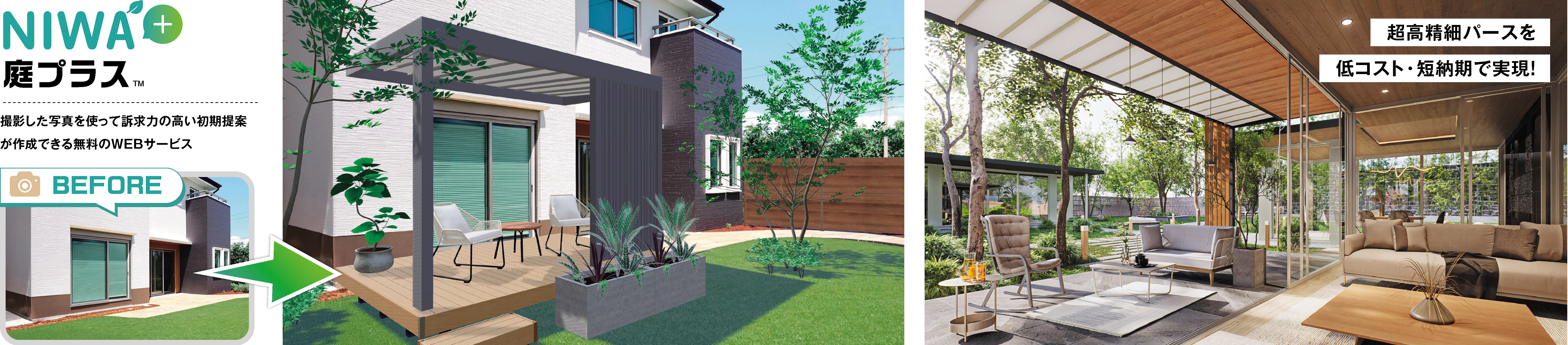 誰でも簡単に、庭の初期提案が可能な無料プランニングツール「庭プラスTM」をはじめ、お客様の要望を忠実に再現可能な、高精細パース・動画・VR制作サービスなど、お困りごとに合わせたデジタルソリューションを体験いただけます。また、生成AI技術を組み込んだ新しいサービスも公開予定です。