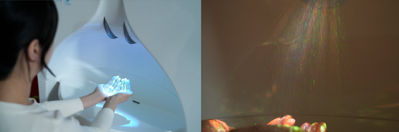 未来を担う子どもたちには手洗いの大切さを楽しく伝えることが重要と考え、今回はプロジェクションマッピングなどをデザインするクリエイティブカンパニー「NAKED,INC.」とコラボレーションし、“楽しく”手のひらにプロジェクションマッピングを投影し「汚れが落ち、きれいになる」過程を視覚的に再現。手を洗う時間を退屈させないワクワク感のある映像演出がされる仕様となっています。