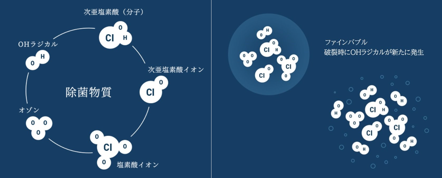水道水をEOCISデバイスで電気分解することで低濃度の除菌物質と洗浄効果の高いファインバブルを含んだ安全性の高い機能的な水道水を生成することができます。ファインバブルが除菌物質を細部まで運び、汚れを浮かし取ると同時に除菌します。また、EOCIS技術で生成された機能的な水道水は、除菌だけでなく、抗ウイルス・消臭・防カビ・アレルゲン除去効果も証明※されています。