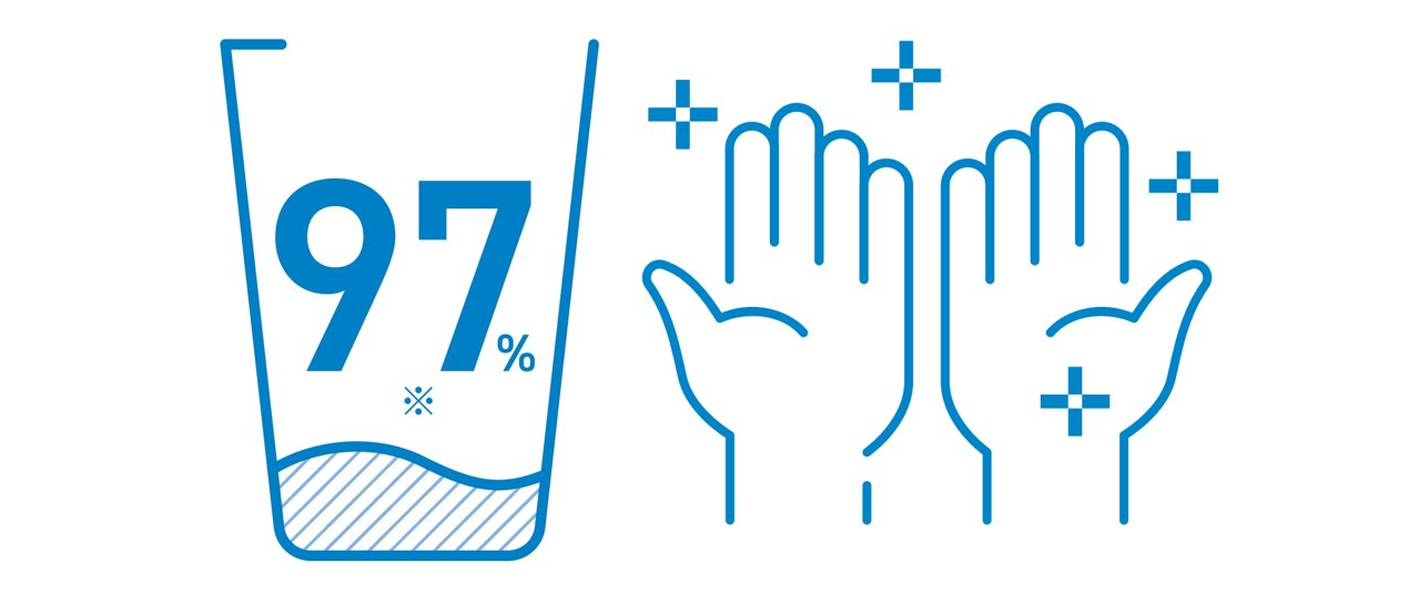 EOCISが生成する機能的な水道水には除菌物質とファインバブルが生成されており、2つのノズルから噴霧するミストが、手肌の細かいシワに入り込んだ細菌や汚れを浮かび上がらせて取り除いてくれます。1回の手洗いで使用される水道水はコップ1杯分のわずか200ml。一般的な蛇口で使用する水道水のおよそ1/30※で手洗いを行うことができます。