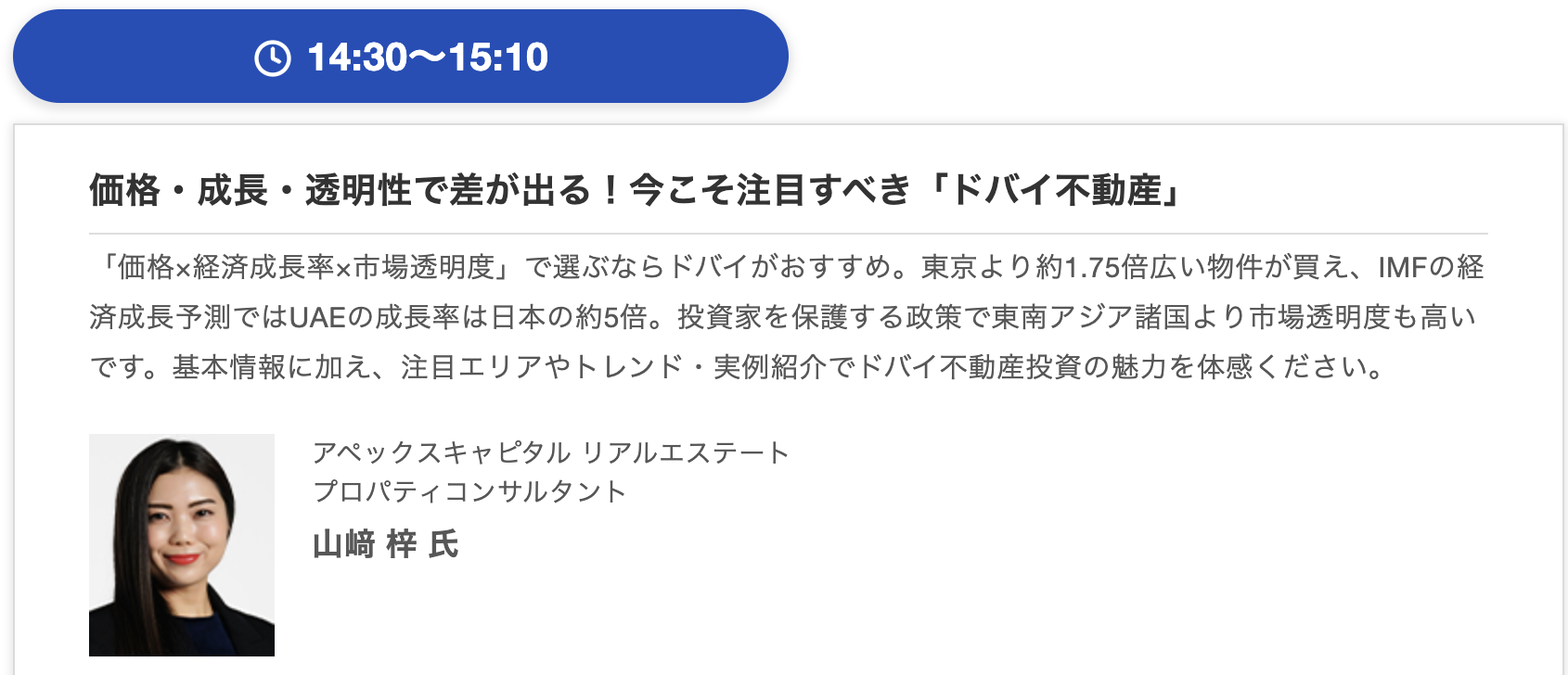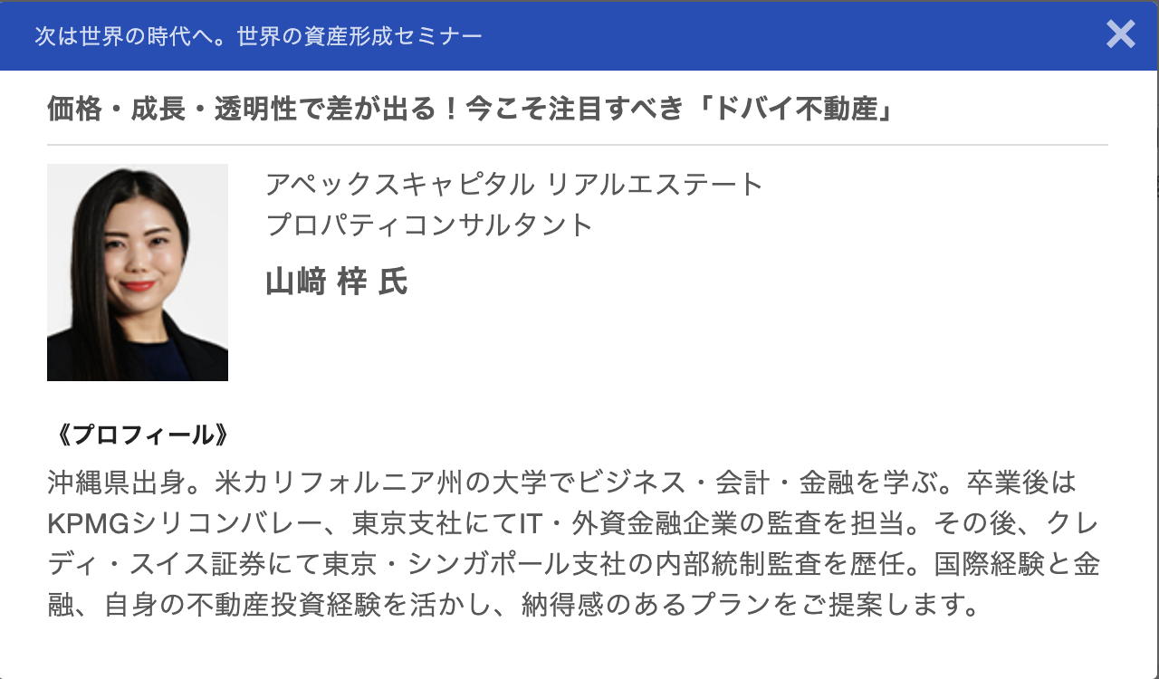 ドバイの不動産売買仲介や不動産管理サービスを手がけるApex Capital Real Estate(アペックスキャピタル リアルエステート)は、2025年6月28日(土)に日経マネーが主催するオンラインセミナー「次は世界の時代へ。世界の資産形成セミナー」に登壇いたします。弊社プロパティコンサルタント・山﨑 梓が、世界の投資家の間で需要が高まっている「ドバイ不動産」の最新事情と魅力をお伝えします。