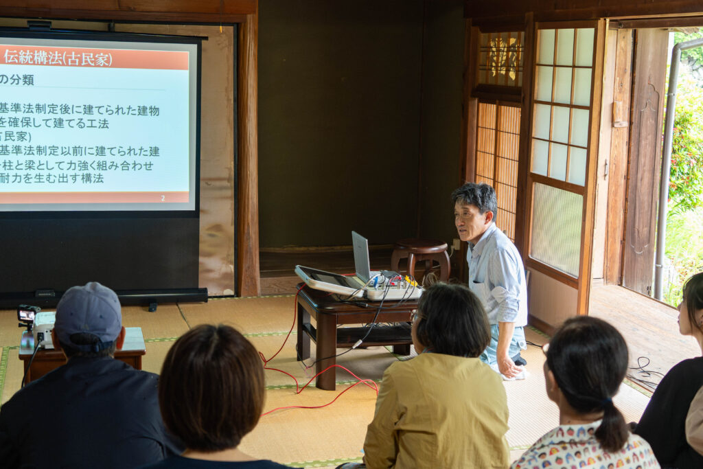 最終回は古民家の伝統工法を対象とした「伝統耐震診断」。講師から在来工法と伝統工法の違いや耐震診断方法について解説があり、会場では土間と屋根裏に地震計を設置し、古民家ならではの揺れを観測しPCで波線を確認しました。