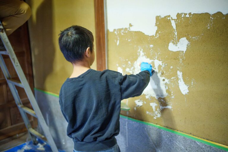 第1回目は、古民家ポータルサイト「クロニカ」を運営し、ご自身も古民家に住まわれている大原氏を講師にお招きし、古民家の魅力や日本の民家の設計の素晴らしさをお話しいただきました。第2回は「伝統的な漆喰塗り」をテーマに、プロの左官職人さんをお招きし、玄関や、土間の漆喰塗りのレクチャーいただきました。大人から子どもまで和やかな雰囲気の中で作業を行いました。