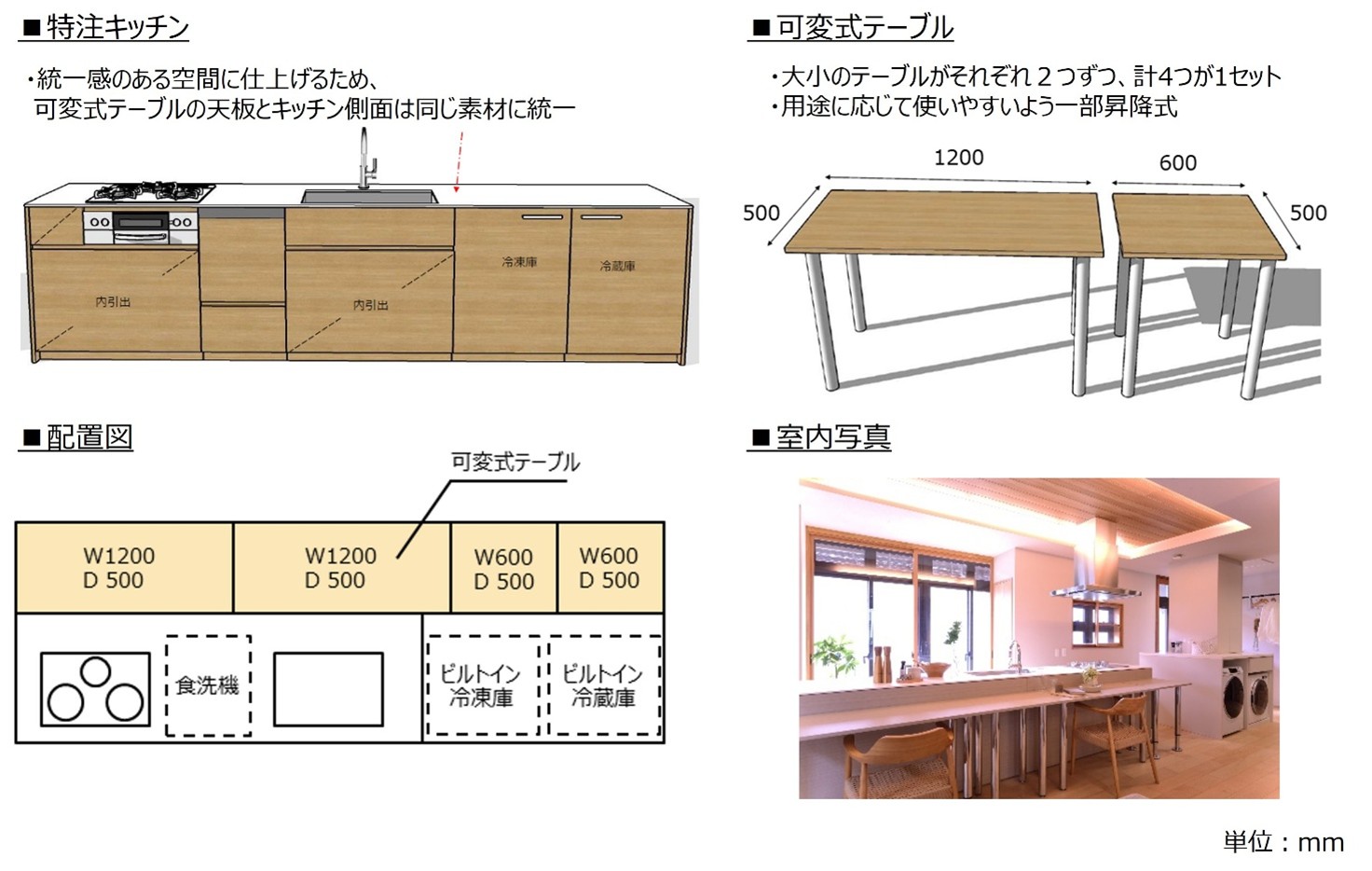 特注キッチンとセット構成で設計した「可変式テーブルユニット」を作製しました。4つに独立できるテーブルで、一部が昇降式となっており、ダイニングテーブルとしての活用だけでなく、ワークスペースや家事作業台など、用途に合わせてLDKの好きな場所に移動して活用することもできます。家族各々の時間を確保し、ゆるやかに自然とコミュニケーションが増える新しいLDK空間の創造に向けて、居住実験で利便性等を検証します。