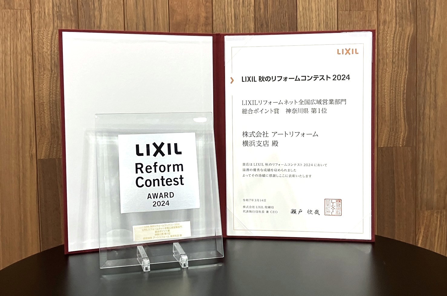 株式会社アートリフォーム(本社:大阪府吹田市、代表者:代表取締役社長 大本哲也、以下「アートリフォーム」)は、住宅設備機器メーカー業界最大手の株式会社LIXILが、LIXILリフォームネット加盟店向けに主催する「第13回LIXIL秋のリフォームコンテスト」にて、「全国広域営業部門 総合ポイント賞 神奈川県 第1位(横浜支店)」および「広域部門 総合ポイント 全国4位」を受賞しました。今回の受賞は、多くのお客様にアートリフォームをお選びいただいた結果であり、関係者の皆さまに心より感謝申し上げます。