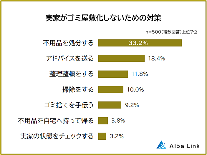 実家がゴミ屋敷化しないためにとっている対策の1位は「不用品を処分する(33.2%)。2位「アドバイスを送る(18.4%)」、3位「整理整頓をする(11.8%)」、4位「掃除をする(10.0%)」が続きます。