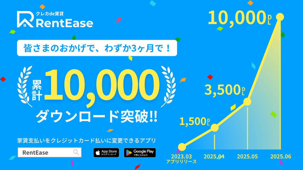 家賃のお支払いをクレジットカード払いに変更できるアプリ「RentEase(レンティーズ)」を提供するPropTech Japan株式会社(本社:東京都港区、取締役:伊藤 幹人)は、2025年3月3日のサービス提供開始から3ヶ月となる2025年6月3日時点で、アプリの累計ダウンロード数が1万件を突破したことをお知らせいたします。