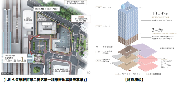 「久留米ザ・タワー レジデンシャル」は、地権者で構成するJR久留米駅前第二街区市街地再開発組合(以下「再開発組合」)がJR「久留米駅」東口側で進める再開発事業「JR久留米駅前第二街区第一種市街地再開発事業」(※1)の敷地内に、4社共同企業体が開発する地上36階建ての分譲マンションです。当マンションは、再開発事業で整備される商業施設などにより、充実した周辺環境を享受できることが特長です。