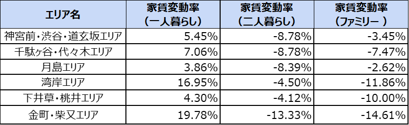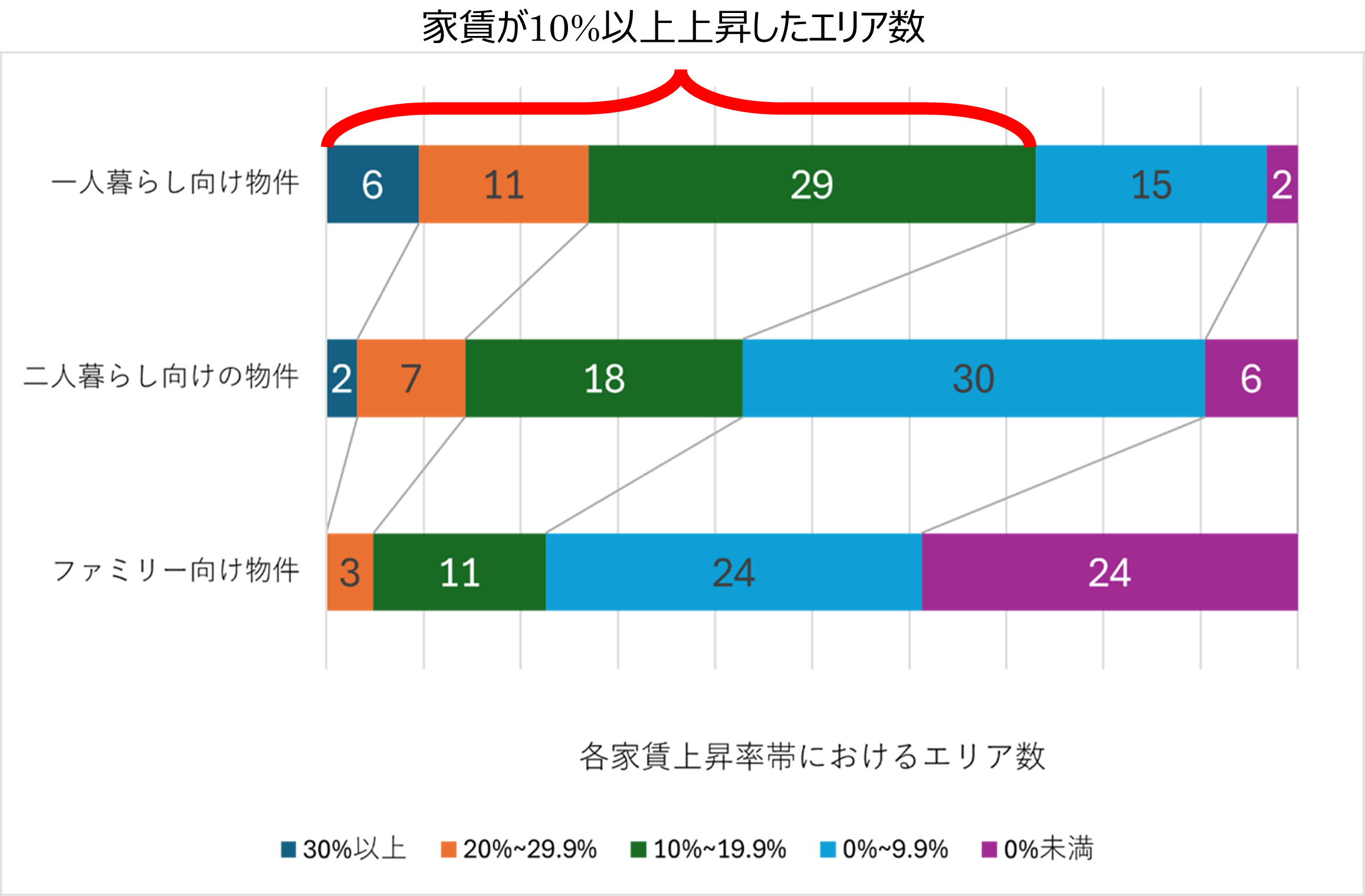 • 一人暮らし向け物件では、平均で15.8%の家賃上昇がみられました。なかでも、30%以上の上昇を記録したエリアは6つありました