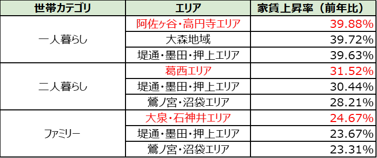 続いて、各世帯カテゴリにおける家賃上昇率トップ3エリアをご紹介します。
