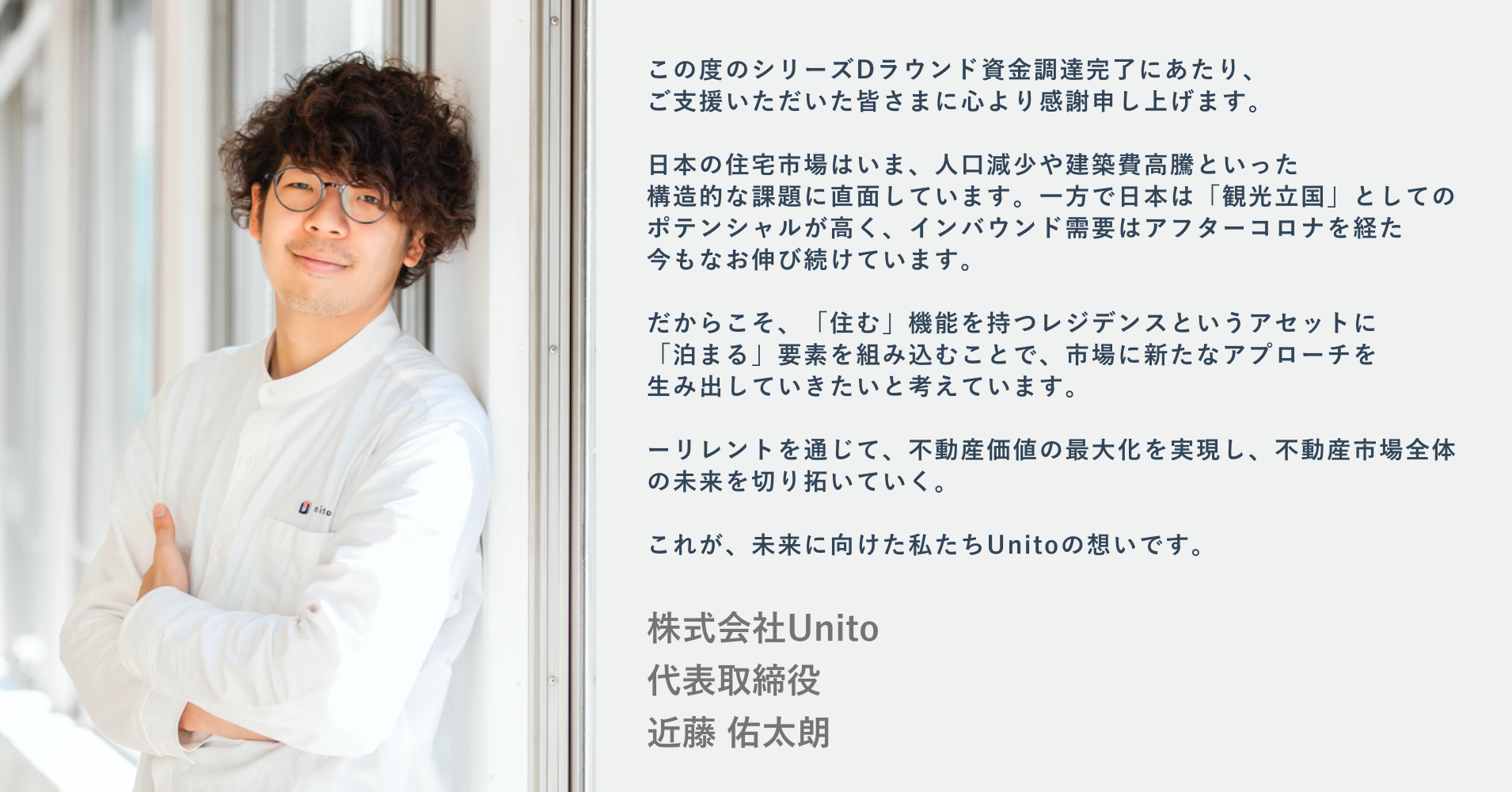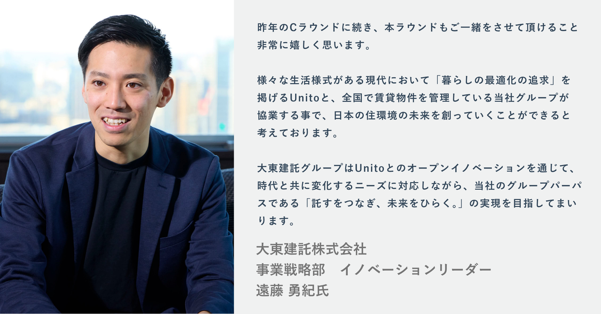 株式会社Unito(本社:東京都目黒区、代表取締役:近藤佑太朗、読み:ユニット、以下「当社」)は、大東建託株式会社、株式会社エイチ・アイ・エスを引受先とした第三者割当増資に加え、金融機関からの融資によりシリーズDラウンド セカンドクローズの資金調達を実施しました。