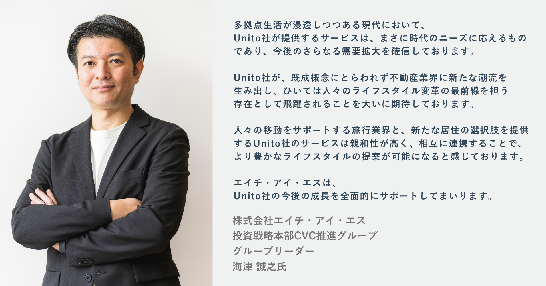 両社の事業基盤およびネットワークを相互に活用し、シナジーの見込まれる領域での連携を強化することで、世界を舞台に活躍・往来するビジネスパーソンや企業の皆様にとって、unitoの暮らしが新たなスタンダードとなることを目指しております。