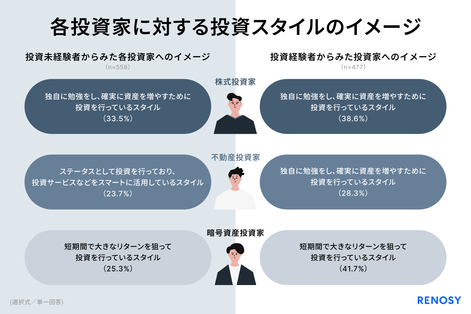 株式会社GA technologies[GAテクノロジーズ](本社:東京都港区、代表取締役 社⻑執行役員 CEO:樋口 龍、証券コード:3491、以下「当社」)が運営するAI不動産投資サービス「RENOSY(リノシー)」は、投資経験者477人と投資未経験者558人の計1,035人に対して「投資家“イメージ”と“実態”調査」を実施しました。なお、投資経験者の中でも「株式投資・不動産投資・暗号資産投資」経験者はさらに分析を実施し、「株式投資家」「不動産投資家」「暗号資産投資家」(以下、総称し「各投資家」)別にまとめました。