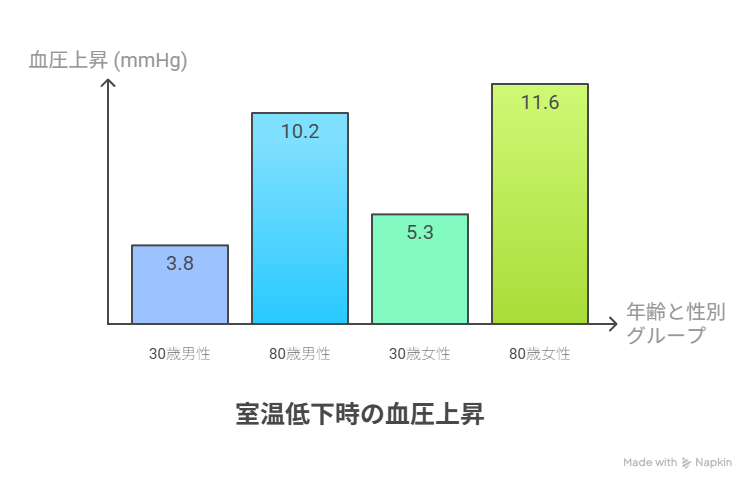 さらに注目すべきは、年齢と性別による温度感受性の違いです。国際医学誌「Hypertension」2019年10月号掲載の研究では、室温が20℃から10℃に低下した際の血圧上昇について以下が確認されています: