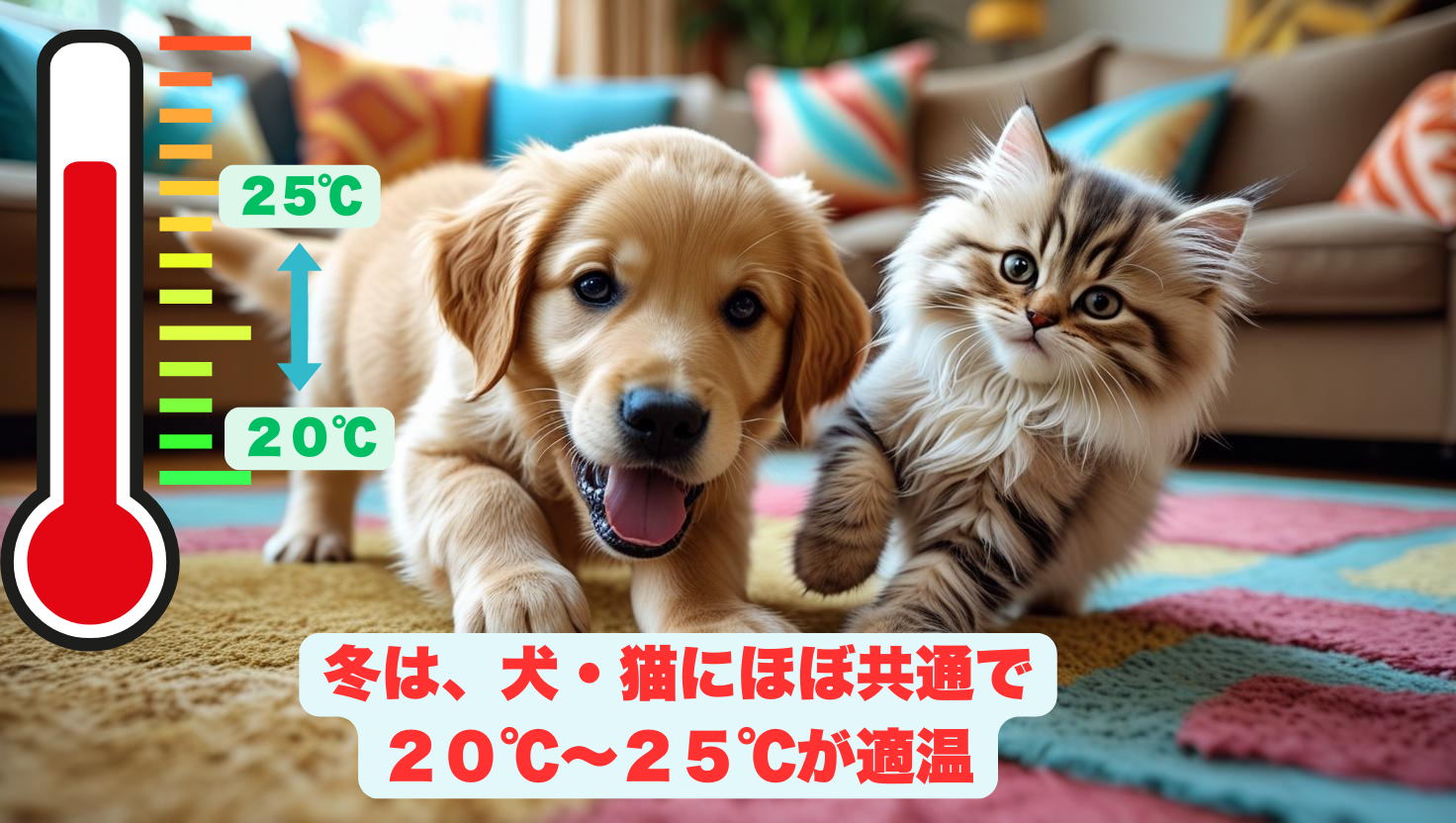 犬・猫の最適な温湿度環境について、科学的データに基づくと、冬は犬・猫にほぼ共通で20〜25℃が適温とされており、これは人間の理想環境と完全に一致します。恒温動物が体温を一定に保つために特別なエネルギーを必要とせず、基礎代謝だけで体温を維持できる「サーモニュートラルゾーン」が気温20〜25℃なのです。