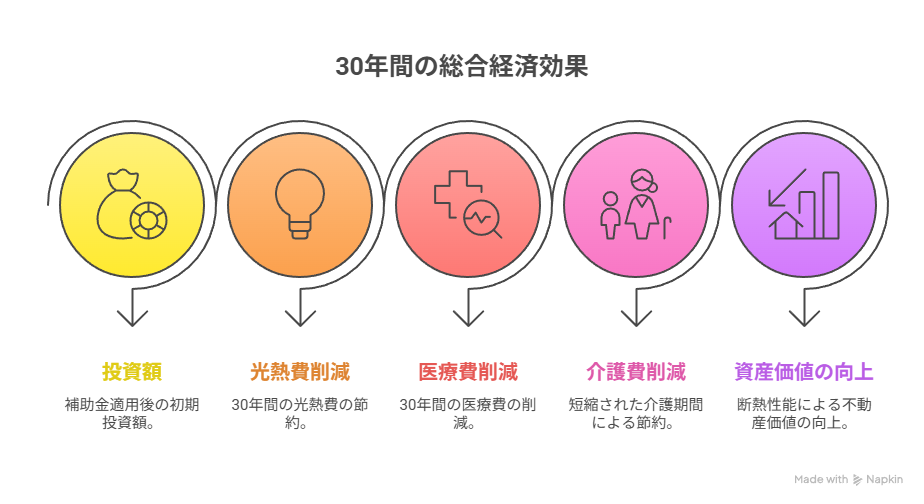 この分析により、ROI(投資回収率)は最大266%と極めて高い経済効果を示しており、断熱改修は純粋な「健康投資」として優れた選択肢であることが実証されています。