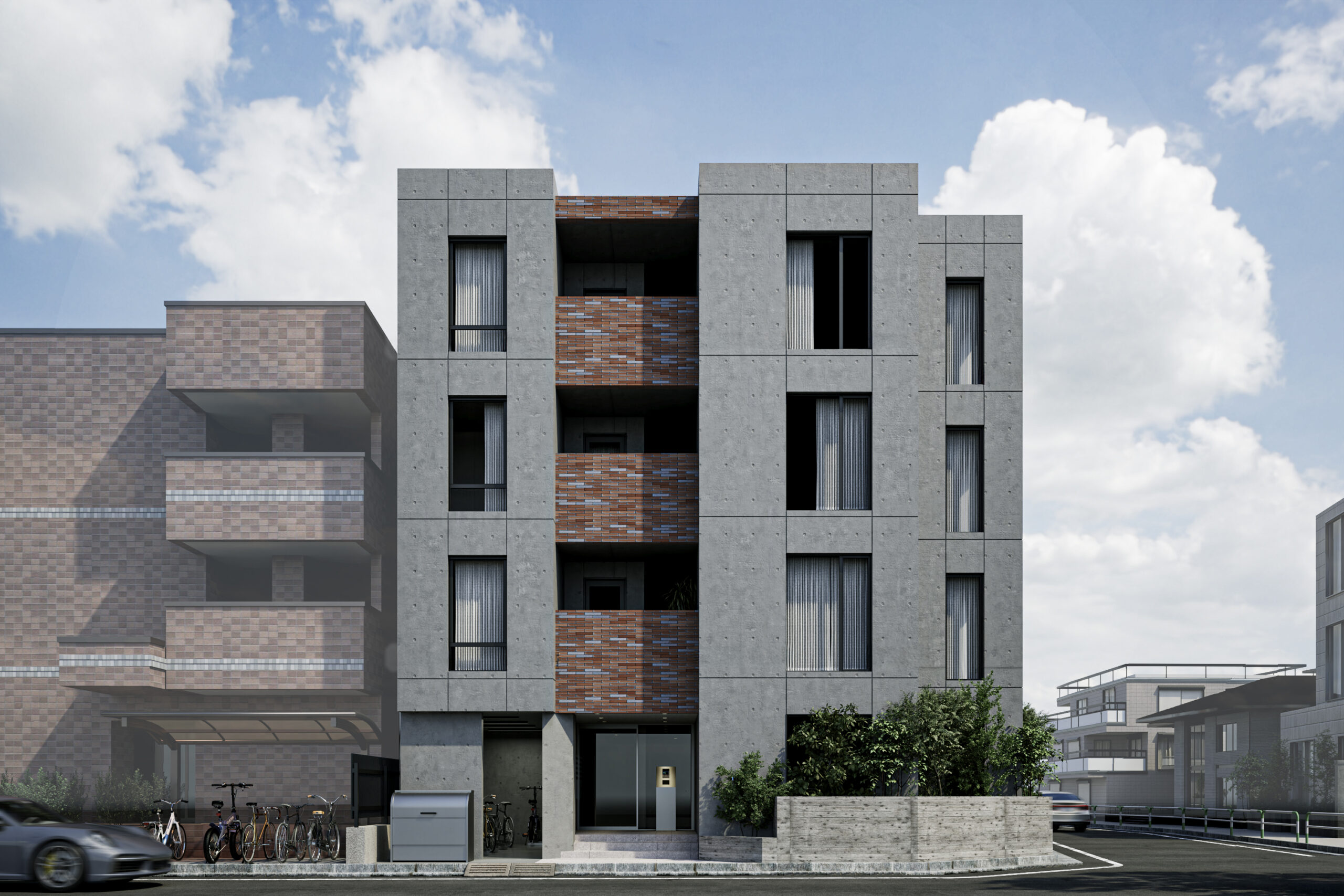 本物件は、緑豊かな公園が点在する、落ち着きのある閑静な住宅街に位置しています。全住戸の間にスリット状の吹抜けを設けることで、プライバシーを確保しながらも共用部分に光と風を導き、開放的で明るい空間を実現しています。また、自然に恵まれた周辺環境の魅力を活かして自然の風景や光を取り入れ、住まいに新たな視点と豊かな空間の広がりを与える設計といたしました。