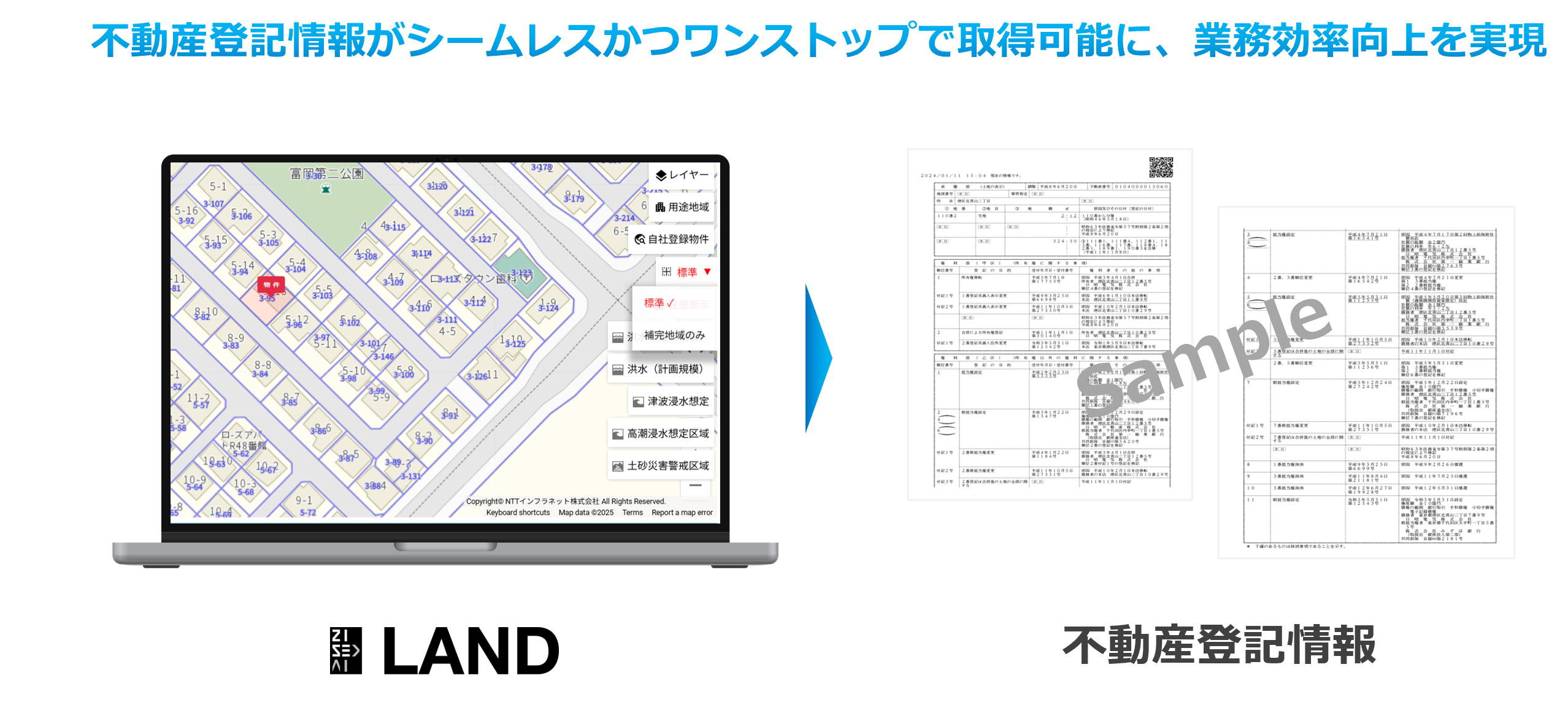 このような背景の中、LANDがオプションとして提供する不動産登記情報自動取得機能は、マップ上で物件情報を登録・閲覧しながら同一サービス内で不動産登記情報の取得ができるほか、取得した不動産登記情報は関連資料としてLANDシステム内に保存可能なことで別途社内共有の手間が省ける等、画面の切り替えや資料管理といった煩雑な手順をなくし、大幅な業務効率化を実現いたします。また、物件情報の登録・管理と地番情報の連携、不動産登記情報の取得がワンストップかつシームレスに完結することで、複数のツールをまたいで情報を連携する必要がなく、常に最新・正確な不動産登記情報を一元管理することが可能となります。