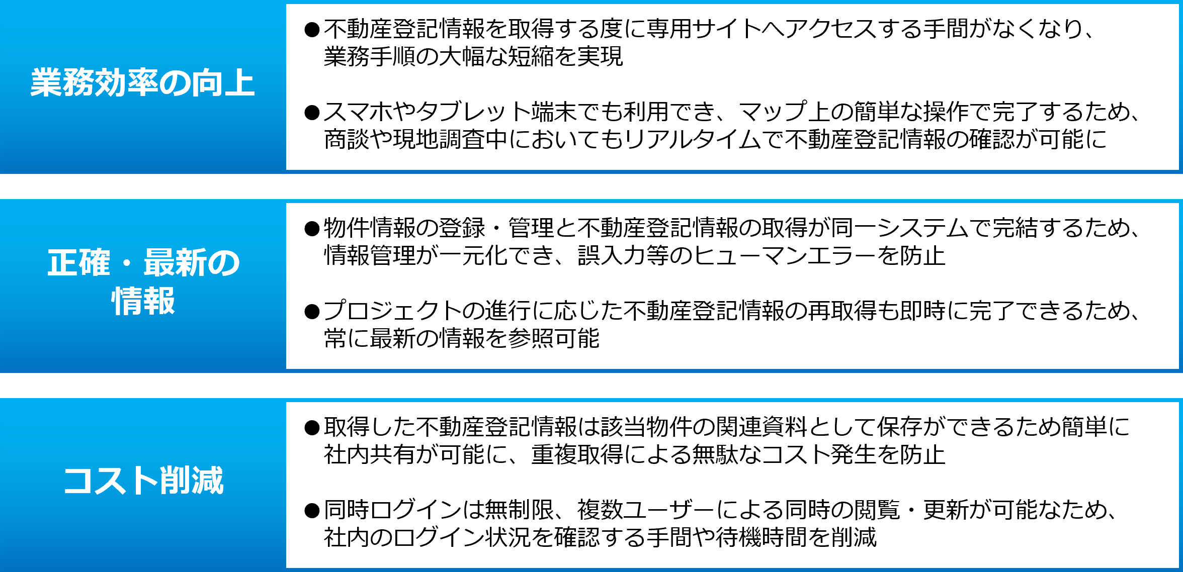 不動産取引において必須となる不動産登記情報は、専用サイトへアクセスして取得することで業務の連続性が途絶えてしまったり、取得情報の社内共有には別途資料化をする必要があることで、その取得や管理にかかる手間が課題とされてきました。