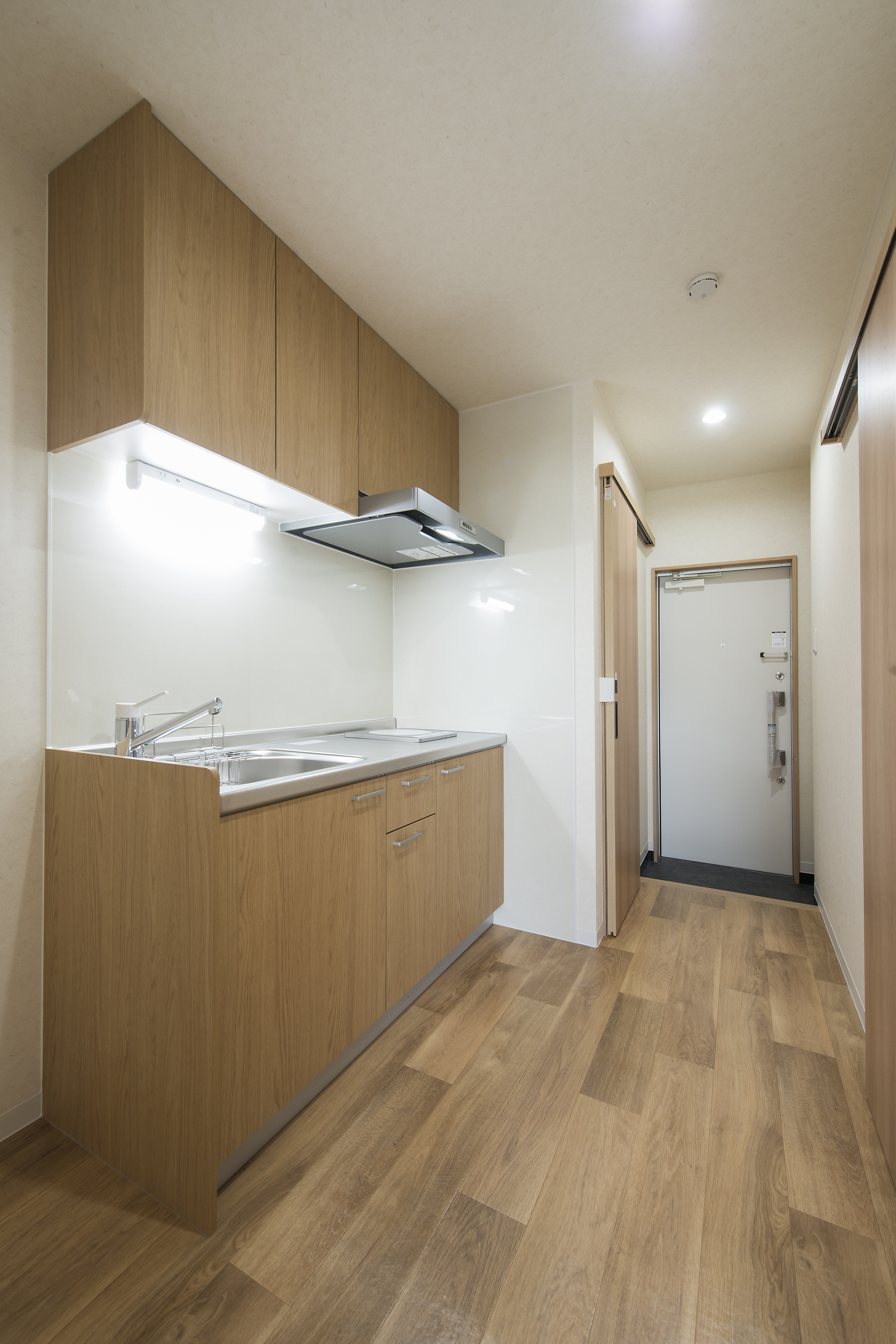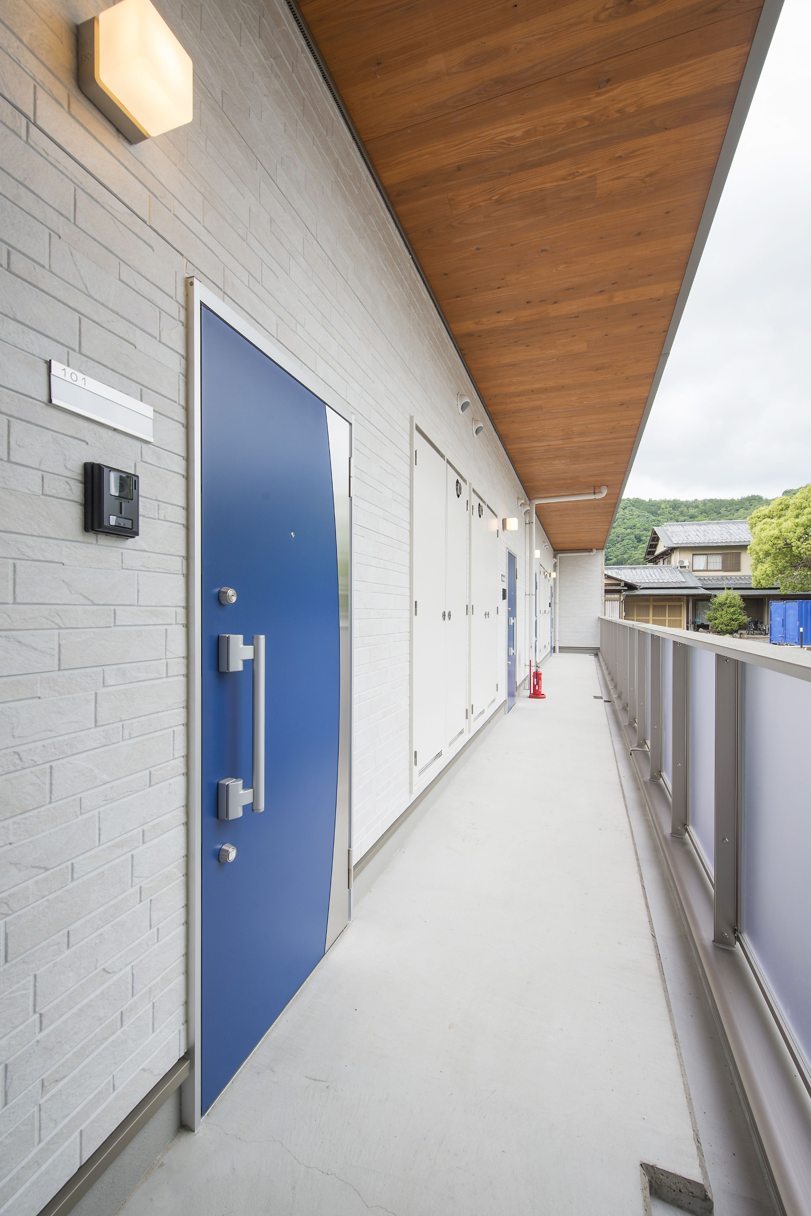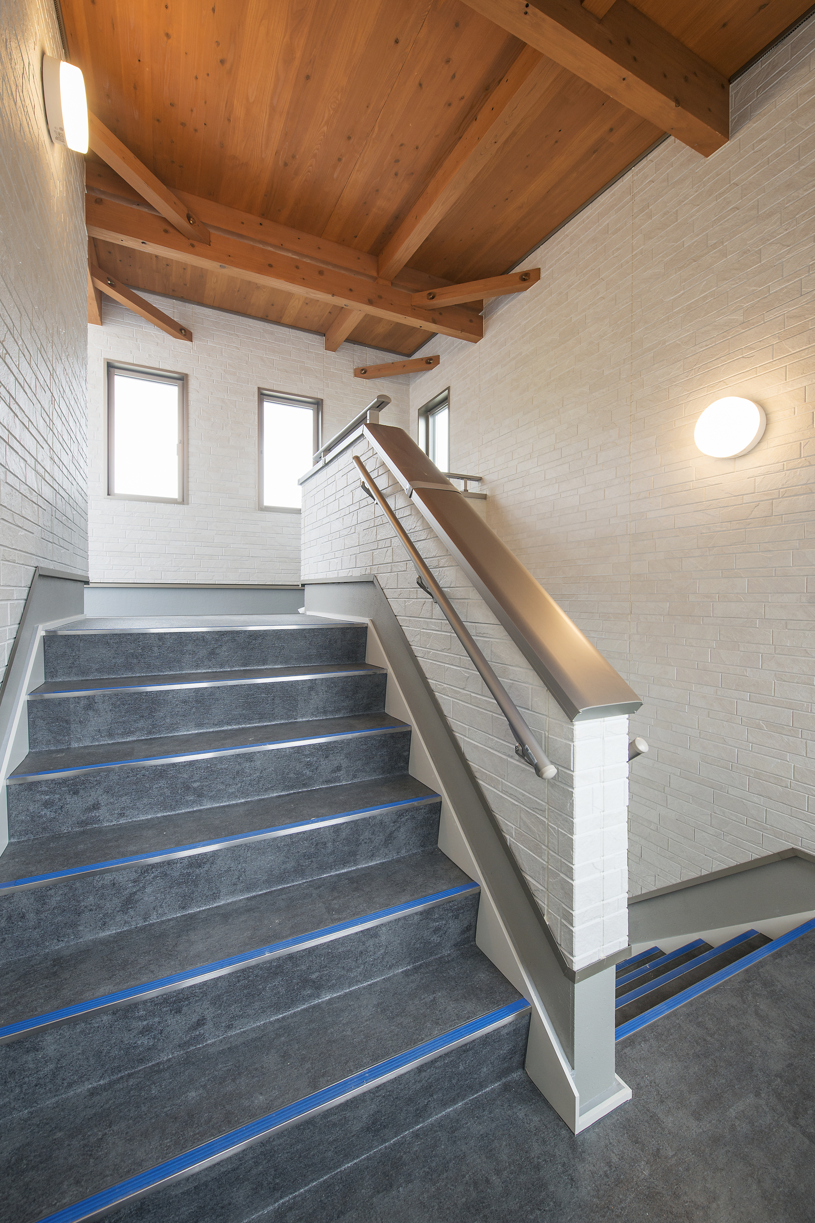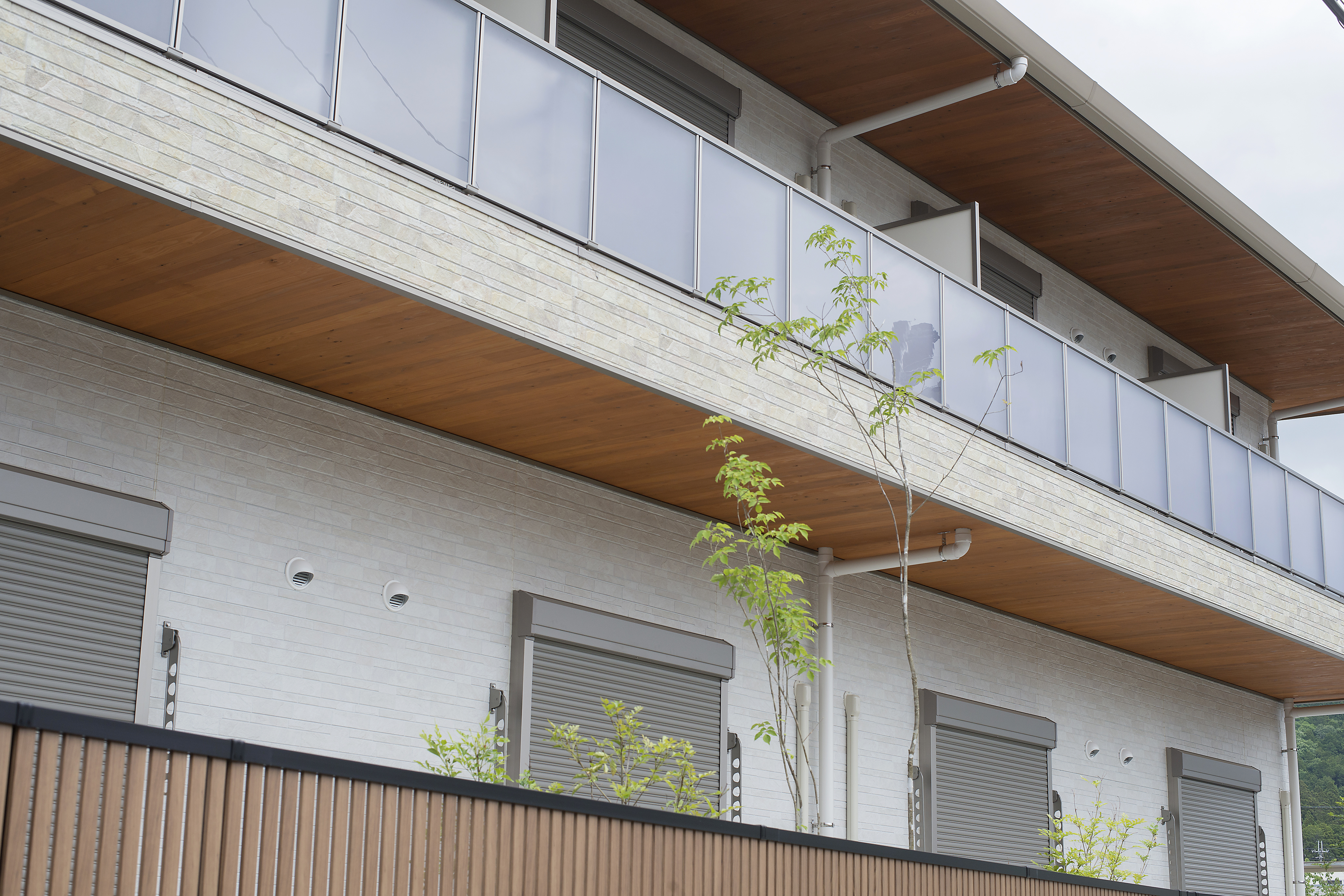 本建物は水平構面にCLTパネルを利用した木造軸組工法2階建てで、軒天と共用廊下および階段の天井をCLTの現し仕上げとし、併せて木目を基調とした内装とすることで木のぬくもりを感じられる住環境を実現しました。