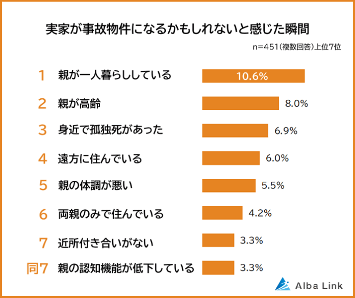 株式会社AlbaLink(本社:東京都江東区、代表取締役:河田 憲二)は、実家から出て暮らしている451人を対象に「実家が事故物件になるかもしれないと感じた瞬間に関する意識調査」を実施し、そのデータをランキングにしました。