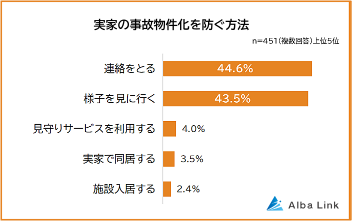 「実家の事故物件化を防ぐためにどのような方法をとっているか」という問いには、「連絡をとる(44.6%)と回答した人が最も多く、僅差の2位は「様子を見に行く(43.5%)」でした。