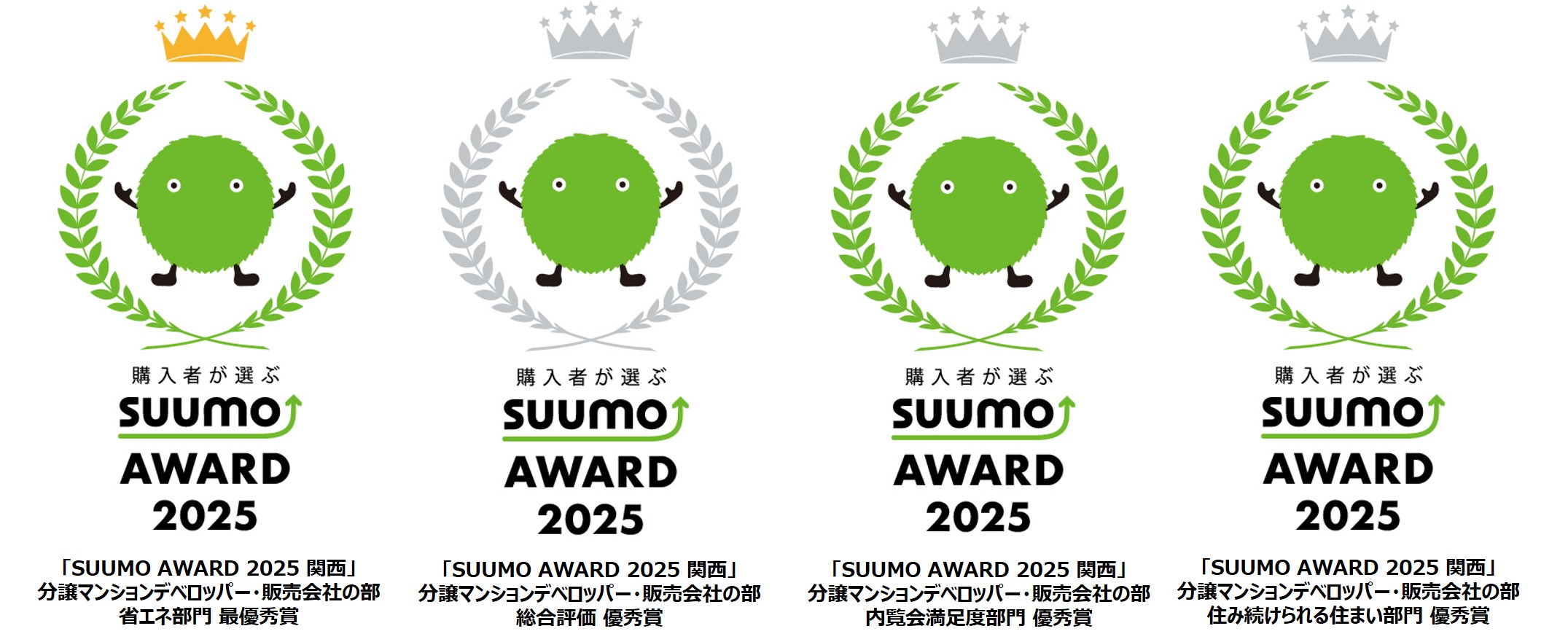 「SUUMO AWARD 2025 関西」は、株式会社リクルートが関西圏(大阪府・京都府・兵庫県・滋賀県・和歌山県・ 奈良県)それぞれで新築マンションを購入した方を対象に、分譲マンションデベロッパー・販売会社や管理会社の品質や価格、取組み内容など、様々な観点での満足度を調査し、その結果をランキングしたものです。