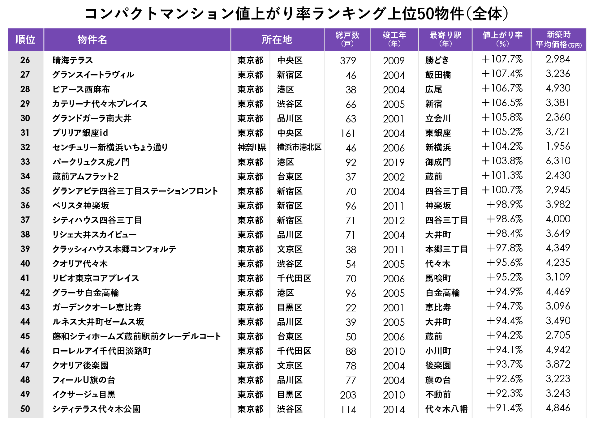 今回はコンパクトマンションの価格値上がり率を調査しましたが、一般的なファミリー物件とは異なり、築年数が古く新築分譲当時の価格が安い物件のほうがより値上がり率が高い傾向がありました。