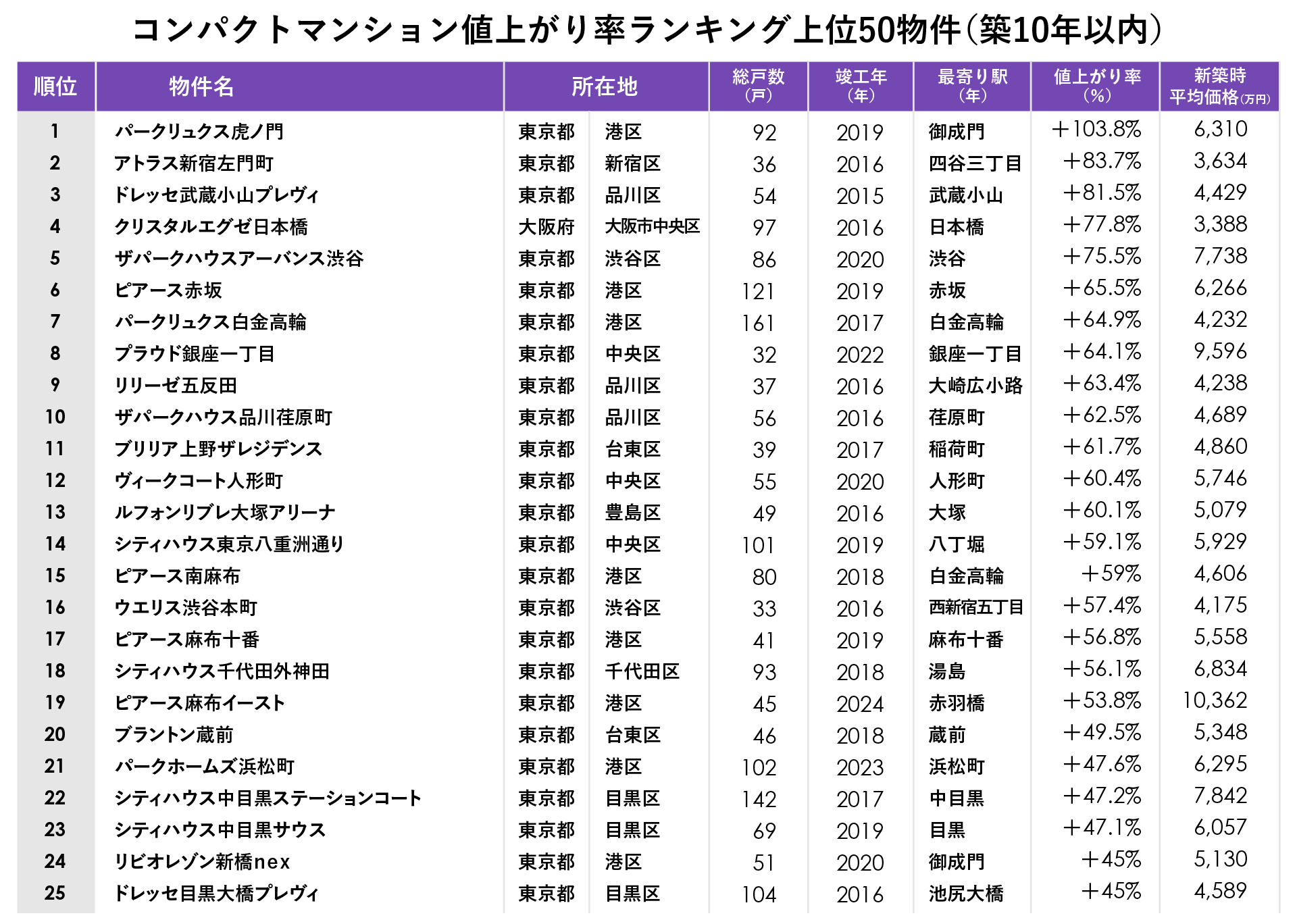 今回は、2024年に流通した中古マンションの中でコンパクトマンションに絞り、中古価格と新築時価格を比べた際の価格値上がり率が高い順にランキングにしました。