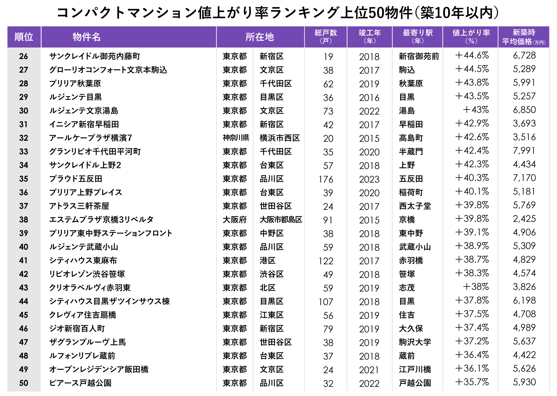 尚、集計対象には関西、東海エリアも含まれていますが、値上がり率上位には京都府と大阪府でそれぞれ1物件ずつがランクインするにとどまりました。