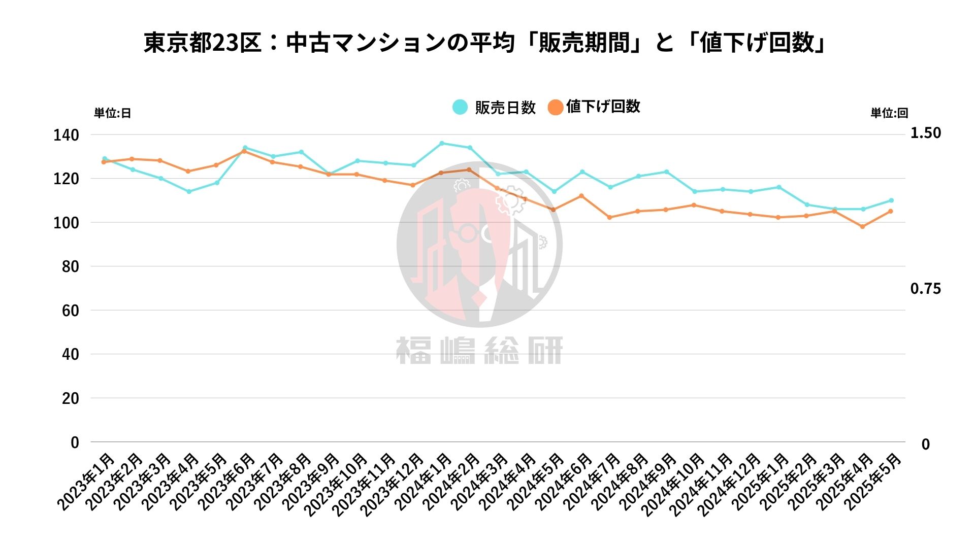 不動産価格の高騰が続く中で注目すべきは、東京都23区内の中古マンションに関する販売動向です。以下のグラフ1では、一般消費者向け中古マンションにおける「販売日数」と「値下げ回数」の推移を示しています。