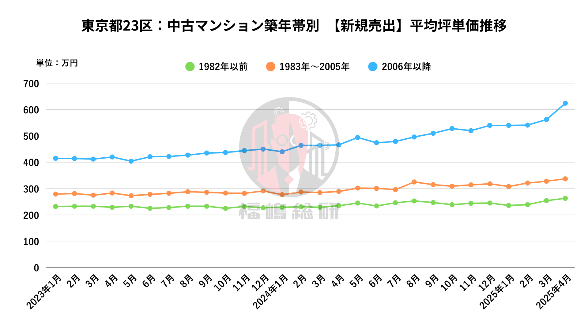 興味深いことに、2005年以前に建てられたマンションは比較的緩やかな上昇にとどまっているのに対し、2006年以降に建築されたマンションは急激な価格上昇を見せています。