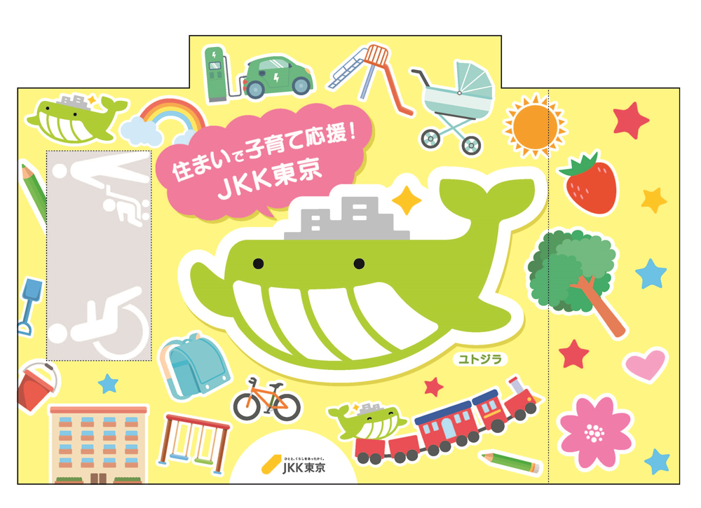 JKKのイメージキャラクター「ユトジラ」を中央に大きく、JKK住宅※1、付帯設備(公園遊具、EV充電器)を使って、子どもたちが作ったシール帳をイメージしたデザイン。 車内で過ごす時間を楽しく、かわいいユトジラを知ってもらうきっかけに繋げます。 ※1 JKKが建設、管理する一般賃貸住宅 |