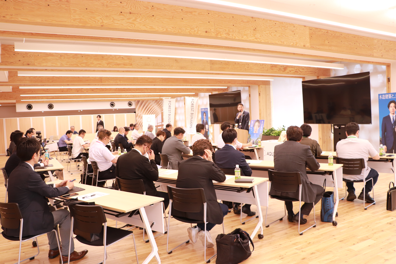 「AQ木のみ構法」で実際に建てられた「AQフォレスト大宮桜木町」の見学は、今回参加した建設会社にとって現実的な規模感である純木造4階建てマンションだったため、積極的な意見交換が行われていました。実際の施工例を目の当たりにした参加者は「耐震等級3を取得する設計手法に感心した」、「とてもラグジュアリーで素晴らしい。音も静かだった」など、納得の様子。また、本社屋で開催された経営セミナーでは弊社のフォレストビルダー事業部、堀野雅人部長が登壇し「約16兆円となっていた非木造市場には、木造を得意とする各社が次々と参入している。法改正や補助金など、国の後押しもあり、まさに建設新時代に突入したのではないか」とし「建設新時代を勝ち抜くためには、鉄骨造や鉄筋コンクリート造と木造の両方が建設可能になることが重要。(中大規模木造建築が)“やりたくてもできない”から“できる二刀流”を目指すべき」と強く訴えました。