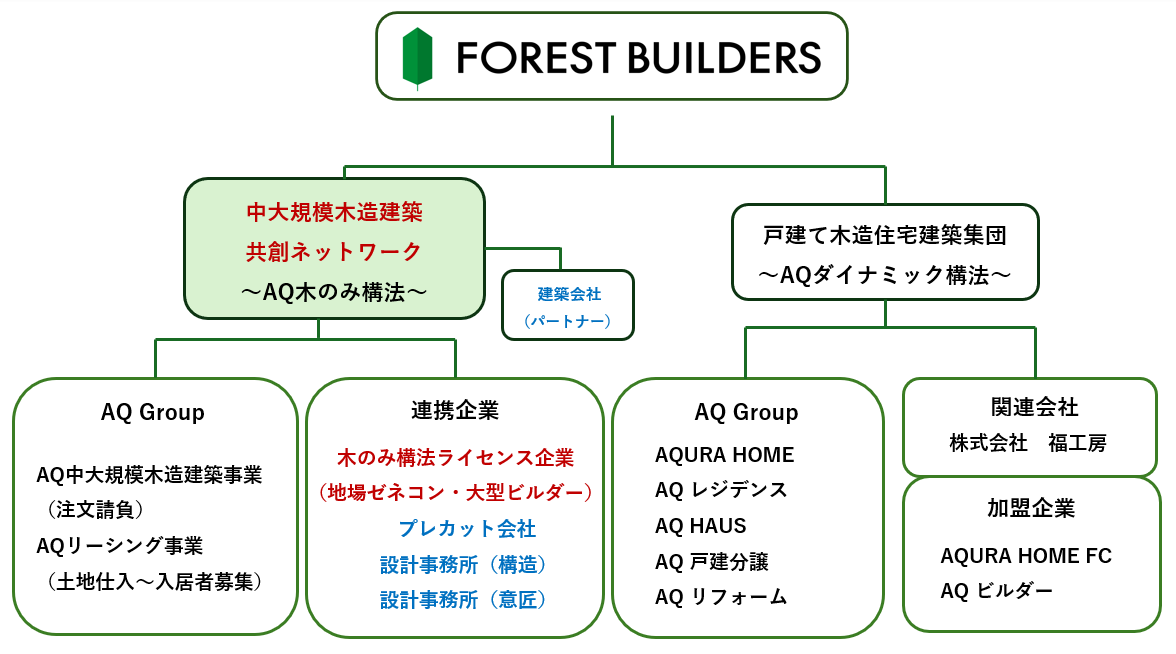 木造注文住宅ブランド「アキュラホーム」などを販売する注文住宅事業に加え、弊社は木造マンション「AQフォレストシリーズ」を第2の事業の柱と位置付けています。しかし、真に木造建築を普及させていくためには「AQダイナミック構法」や「AQ木のみ構法」を活用し、地域ナンバー1を目指す工務店や地場ゼネコンらと“共創”していくことが鍵になると考えます。木造マンションなどの中大規模木造建築を手掛ける「AQ木のみ構法」ライセンス提携企業は、フォレストビルダーズにとって極めて重要な役割を担います。弊社は今後も地球規模のプロジェクト推進のため、フォレストビルダーズを通して鉄骨造も木造も建てられる”地域ナンバー1建設会社創出”の後押しをしていきます。