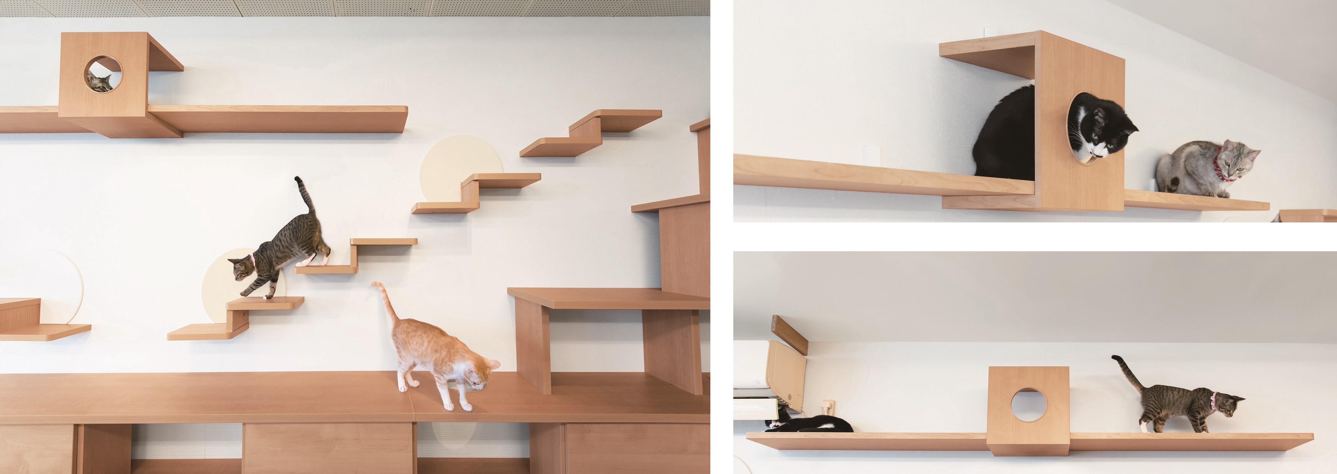 高い場所が好きなねこが、部屋中を自由に動き回れる、壁付けの通り道と、隠れ場所になるボックス