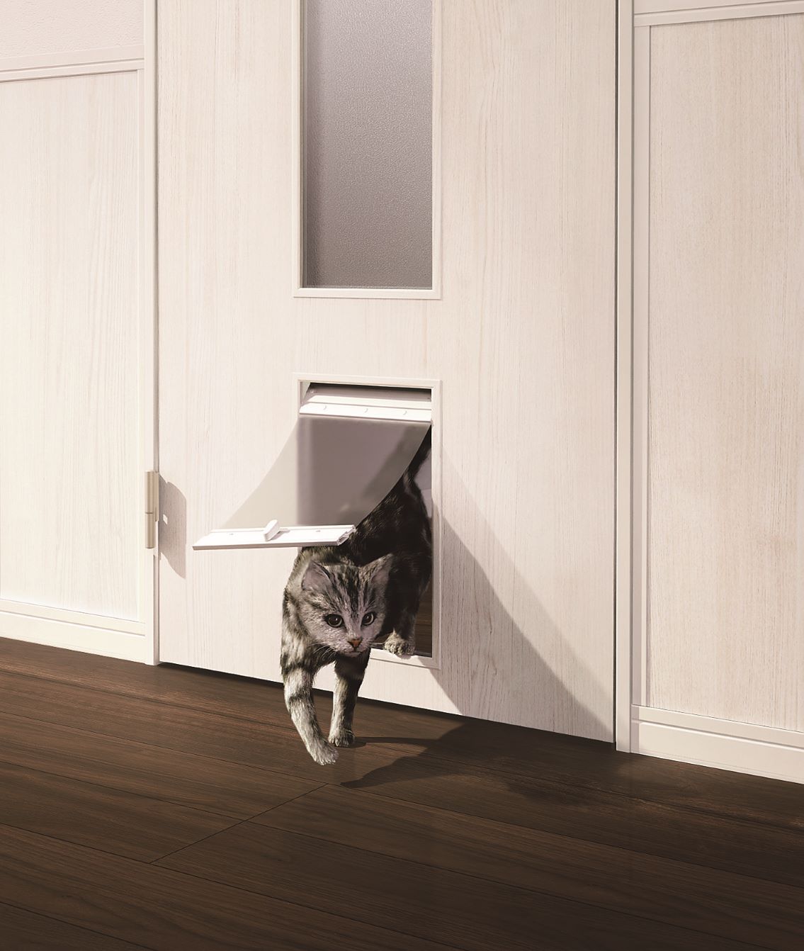 当社では「ペットの家族化」が広まり始めた2000年代初めから、他社に先駆け、“ペット共生住宅向け”の製品開発をスタートしました。2002年1月には、ペットが自由に出入りできるペットドアを発売。以来、小型犬の足腰に配慮した床材や、ひっかき傷がつきにくい壁材、ねこの運動不足解消に役立つ壁面造作部材など、様々なペット建材を生み出してきました。その他、ペットの鳴き声の響きを抑える吸音機能やペットのにおいを軽減する消臭機能を持った天井材も品揃えしており、これら製品を組み合わせてご提案することで、ペット飼育時に生じる様々な悩みの解決を図っています。