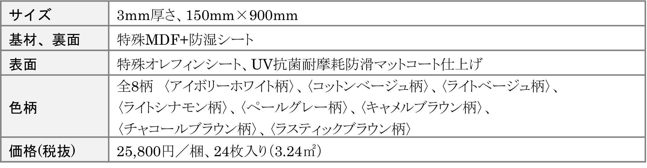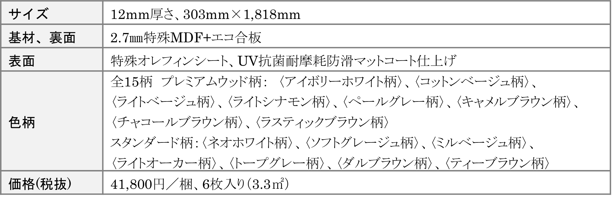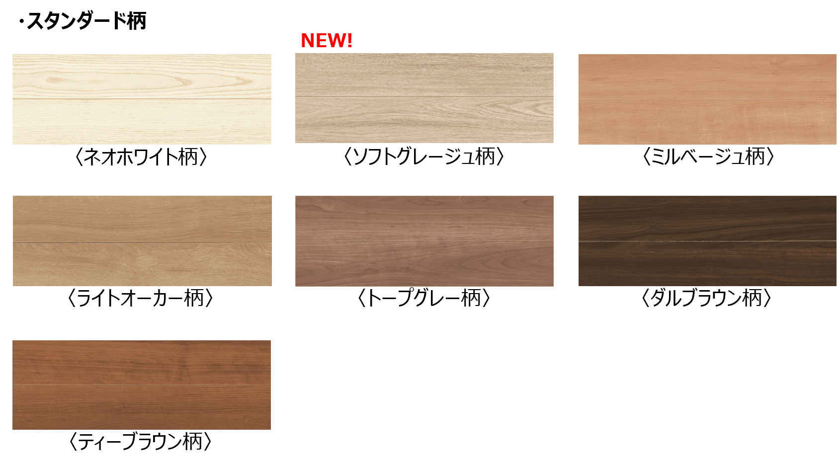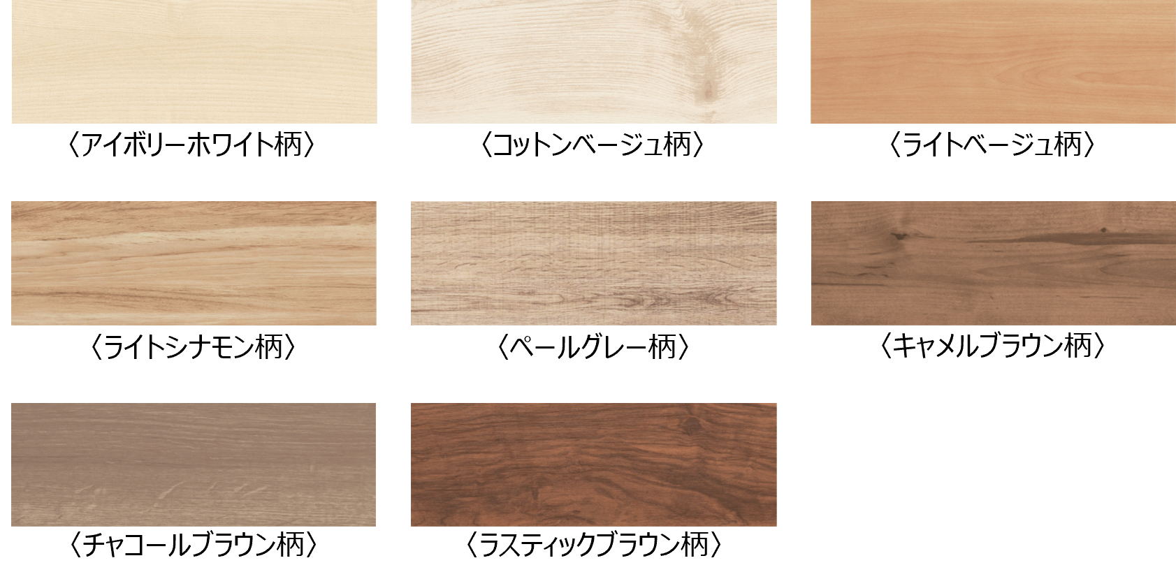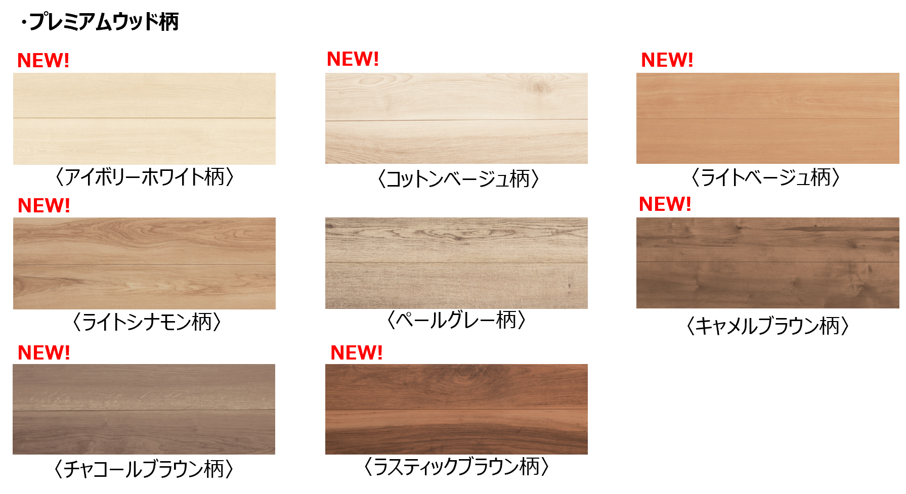 プレミアムウッド柄として7柄を新たに追加(ペールグレー柄は既存柄)したほか、スタンダード柄にソフトグレージュ柄も追加し、全15柄を取り揃えています。